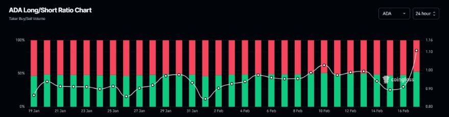 Otra señal alcista es la relación entre posiciones largas y cortas de ADA de Coinglass, que se sitúa en 1.09, el nivel más alto en más de un mes. Esta relación superior a uno refleja un sentimiento alcista en los mercados, ya que cada vez más operadores apuestan por un aumento del precio del activo.