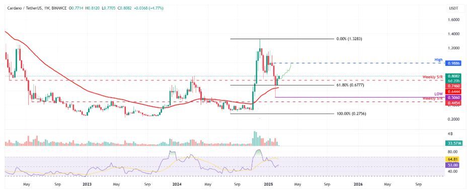 El precio de Cardano encontró soporte alrededor de su nivel de retroceso de Fibonacci del 61.8% (extraído desde el mínimo del 5 de agosto de 0.27 dólares hasta el máximo del 3 de diciembre de 1.32 dólares) en 0.67 dólares la semana pasada. Subió un 13.21%, cerrando por encima del nivel de resistencia semanal de 0.74 dólares. Al comienzo de esta semana, el lunes, continuó subiendo un 4.7%, cotizando alrededor de 0.80 dólares.