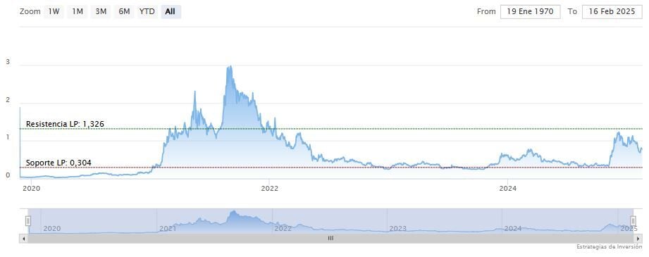 Si el nivel semanal de 0.74 dólares se mantiene como soporte, podría extender el repunte en un 22% desde sus niveles actuales para volver a probar su máximo del 30 de enero de 0.98 dólares.