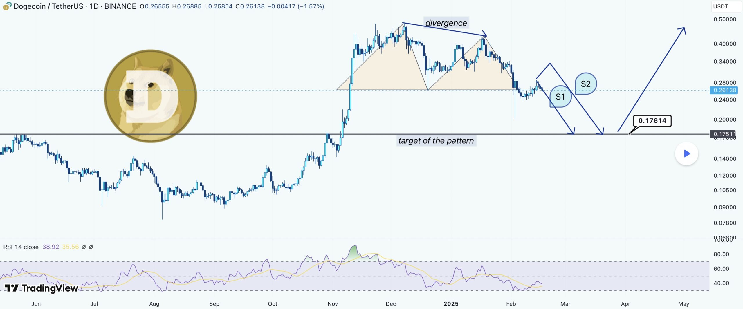 Los indicadores técnicos sugieren que DOGE está cotizando por debajo de su media móvil simple de 100 horas. El analista MelikaTrader94 ha identificado niveles de soporte críticos entre $0.22 y $0.176 – $0.18. A pesar de superar brevemente el nivel de retroceso de Fibonacci del 23.6%, el precio no ha logrado romper puntos de resistencia significativos, con $0.2620 actuando como una resistencia de Fibonacci del 50%.
