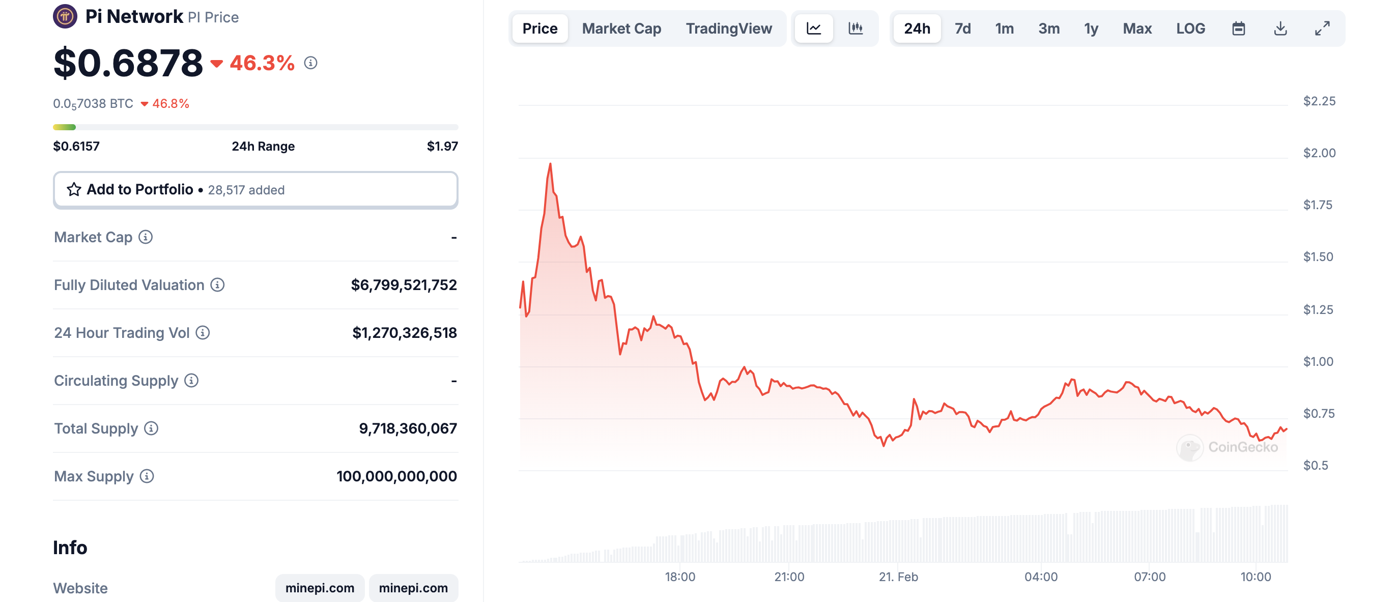 El precio ha caído un 46% en las últimas 24 horas. Al momento de escribir, PI se negociaba a 0.68 dólares. En comparación, criptomonedas similares de plataformas de contratos inteligentes han subido un 1.30%, lo que resalta el bajo rendimiento de PI en el mercado.