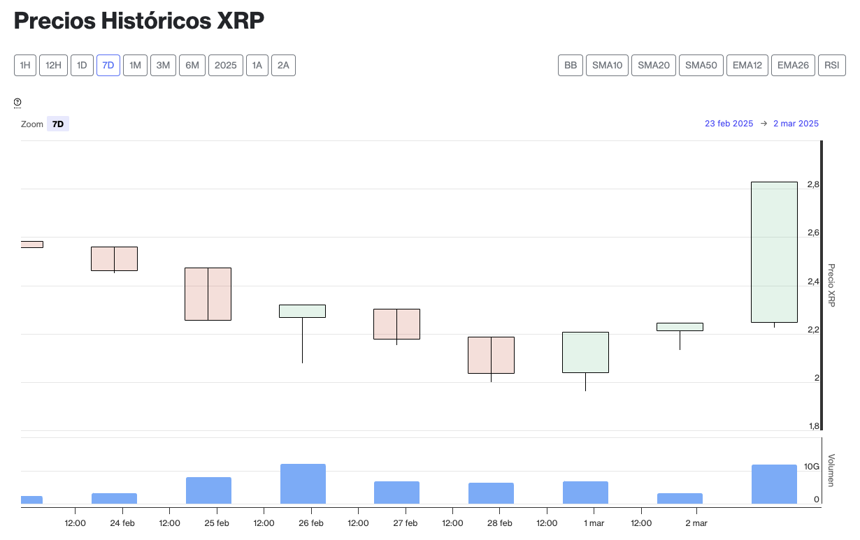 La reacción del mercado no se hizo esperar. Tras el anuncio inicial, ADA subió 70%, mientras que XRP y SOL ganaron 34% y 22%, respectivamente.