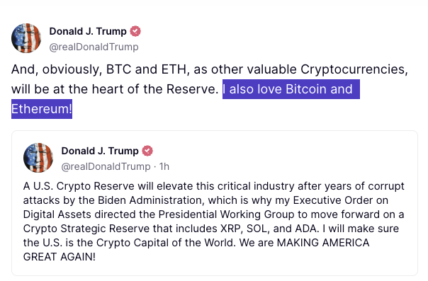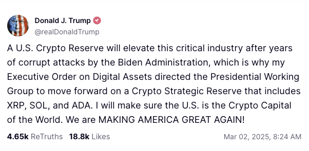 “Una Reserva Cripto de EE.UU. elevará esta industria crítica después de años de ataques corruptos por parte de la Administración Biden, razón por la cual mi Orden Ejecutiva sobre Activos Digitales ordenó al Grupo de Trabajo Presidencial avanzar en una Reserva Estratégica Cripto que incluya XRP, SOL y ADA. Me aseguraré de que EE.UU. sea la Capital Cripto del Mundo. ¡Estamos HACIENDO A AMÉRICA GRANDE OTRA VEZ!”