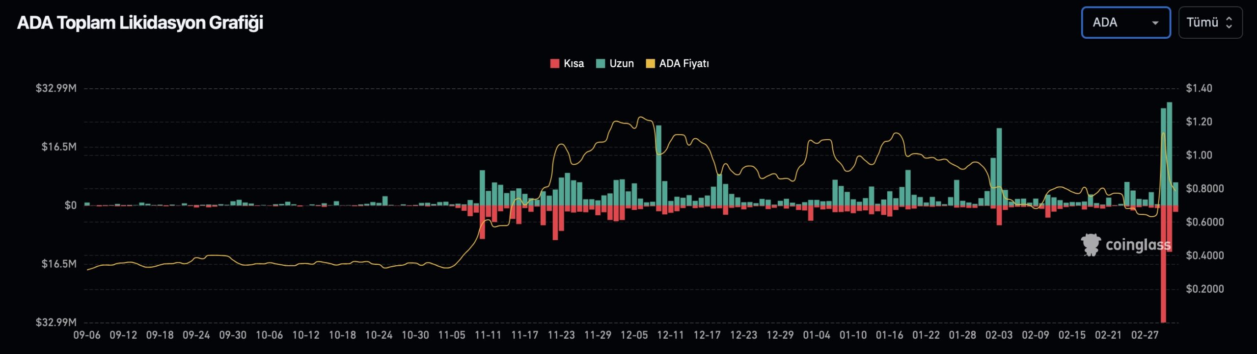 La fuerte caída en el precio de ADA ha puesto a los comerciantes en el mercado de futuros en una posición difícil. Según datos de la firma de análisis en cadena Coinglass, los inversores de ADA perdieron un total de $43.9 millones en las últimas 24 horas. De esta cantidad, $32.2 millones provinieron de posiciones largas, mientras que $11.71 millones fueron de posiciones cortas. La alta volatilidad en el precio ha llevado a liquidaciones significativas, afectando particularmente a aquellos que mantienen posiciones largas.