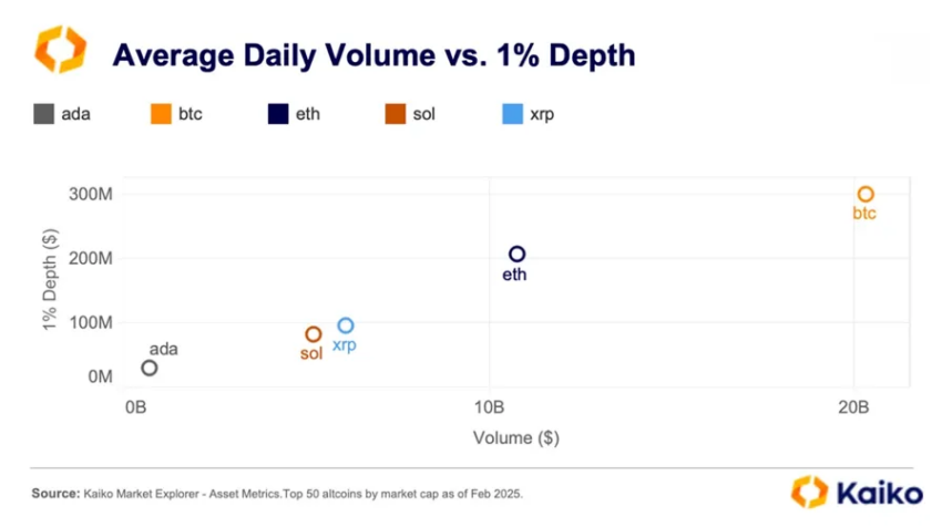 Según el último informe de Kaiko, ADA tiene la menor profundidad de mercado entre las cinco altcoins incluidas en la reserva cripto de Estados Unidos. La profundidad de mercado mide la liquidez, indicando la capacidad del mercado para absorber grandes órdenes de compra o venta sin fluctuaciones significativas en el precio: