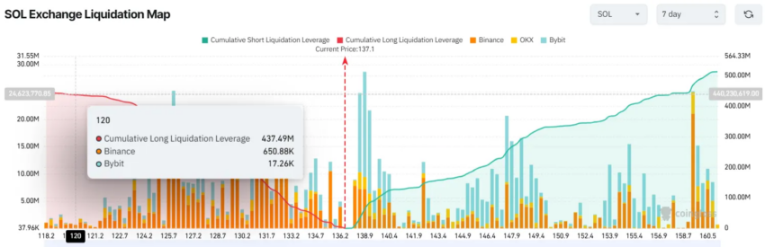 El mapa de calor de liquidación de 7 días para Solana (SOL) indica que las liquidaciones largas podrían superar los 437 millones de dólares si SOL cae a 120 dólares. Esto marcaría una caída adicional del 11% desde su precio actual de 136,3 dólares.