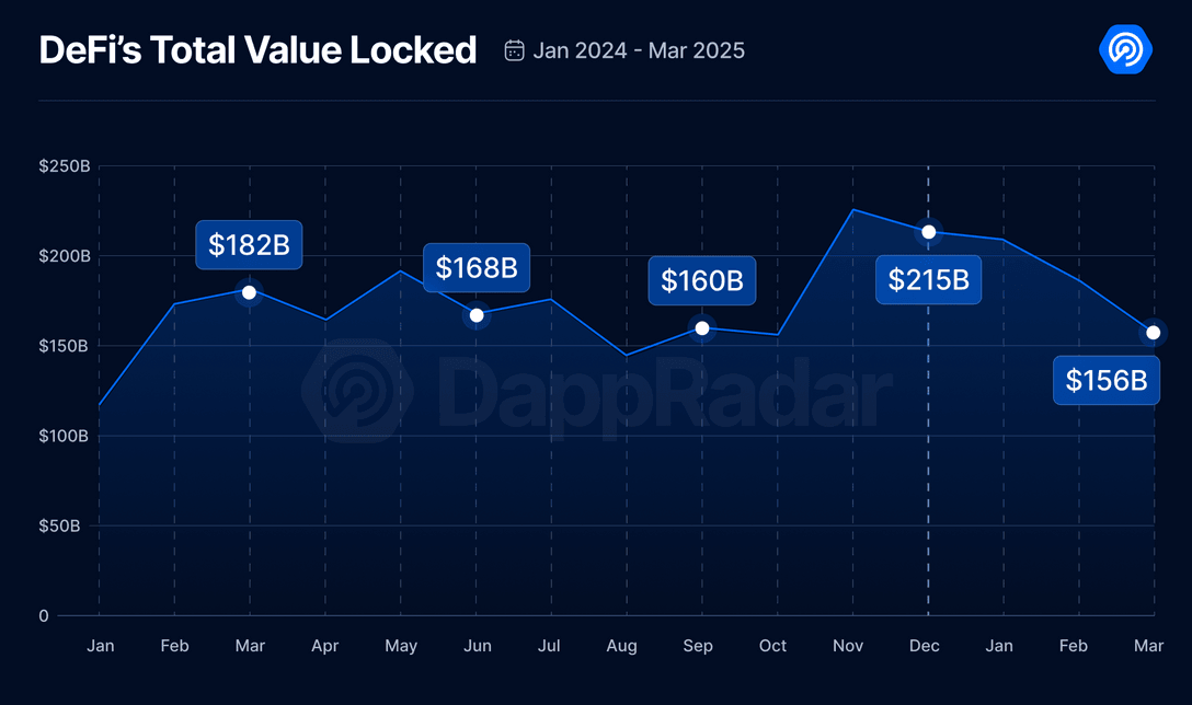 El sector DeFi ha experimentado una disminución significativa en el primer trimestre de 2025, con una caída del 27 % en la TVL, que ha caído a 156 mil millones de dólares frente a 251 mil millones de dólares en 2024. Entre los factores que han provocado esta caída se encuentran la incertidumbre económica generalizada así como incidentes como el hackeo de Bybit.