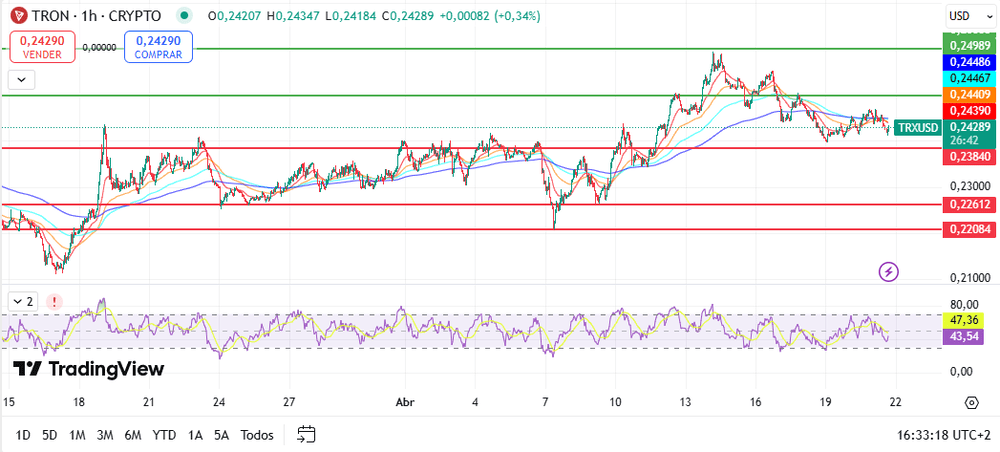 En el momento de la redacción, el precio de TRX cotiza en 0,2431 USD, con pérdidas diarias de 0,74%, semanales de 4,56% y ganancias mensuales de 3,30%.