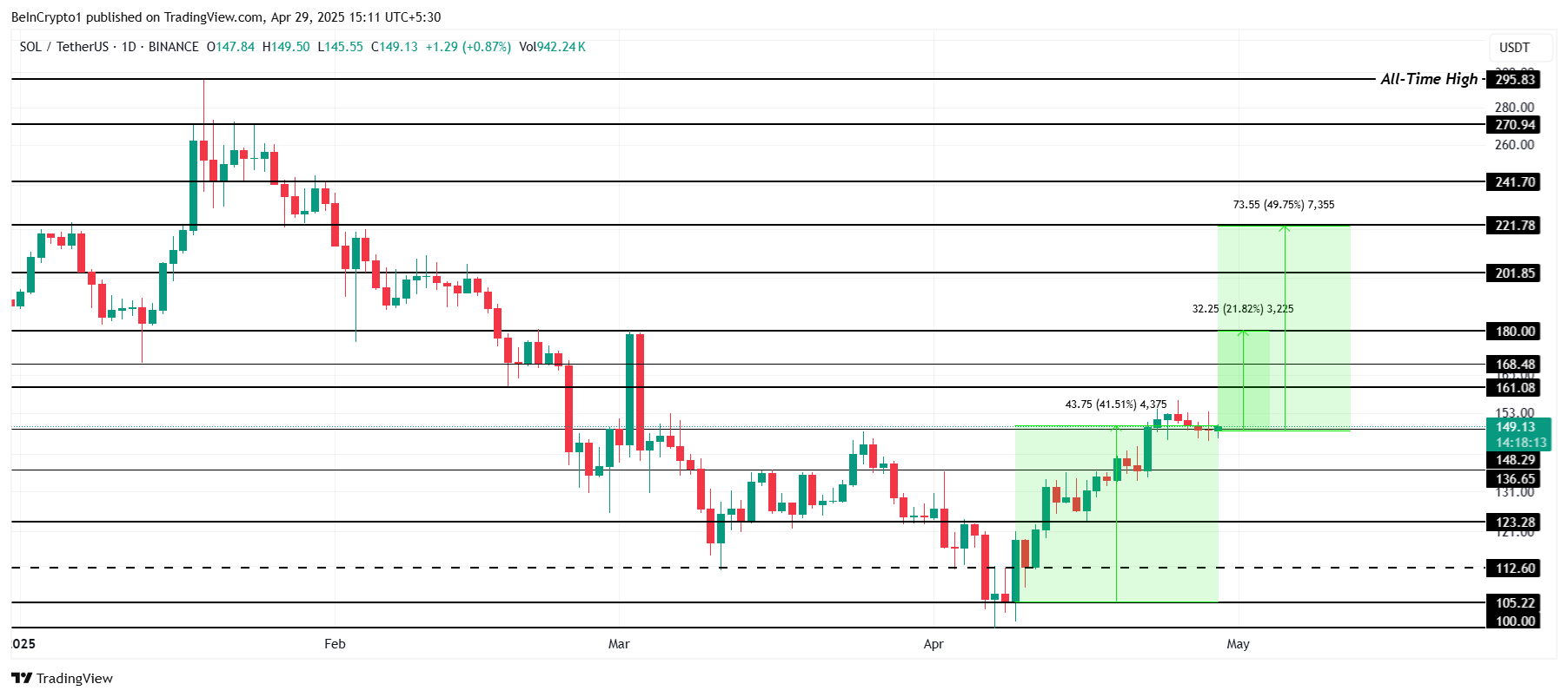 El precio de Solana ha aumentado un 41% este mes, alcanzando 149 dólares en el momento de escribir esto. La próxima gran resistencia está en 180 dólares, y superar este nivel marcaría una recuperación significativa de las pérdidas experimentadas en marzo.