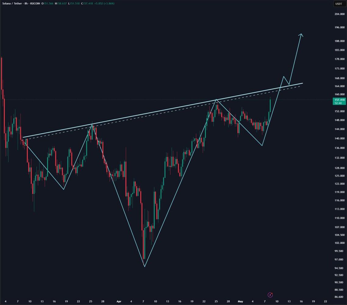 En una publicación de X, Crypto Zeinab afirmó que SOL está formando un patrón de cabeza y hombros invertido en el marco temporal superior. El analista comentó además que SOL enfrentará un punto de ruptura en el nivel de precio de 160 dólares, lo que podría conducir a un repunte a 180 dólares y 200 dólares a continuación.