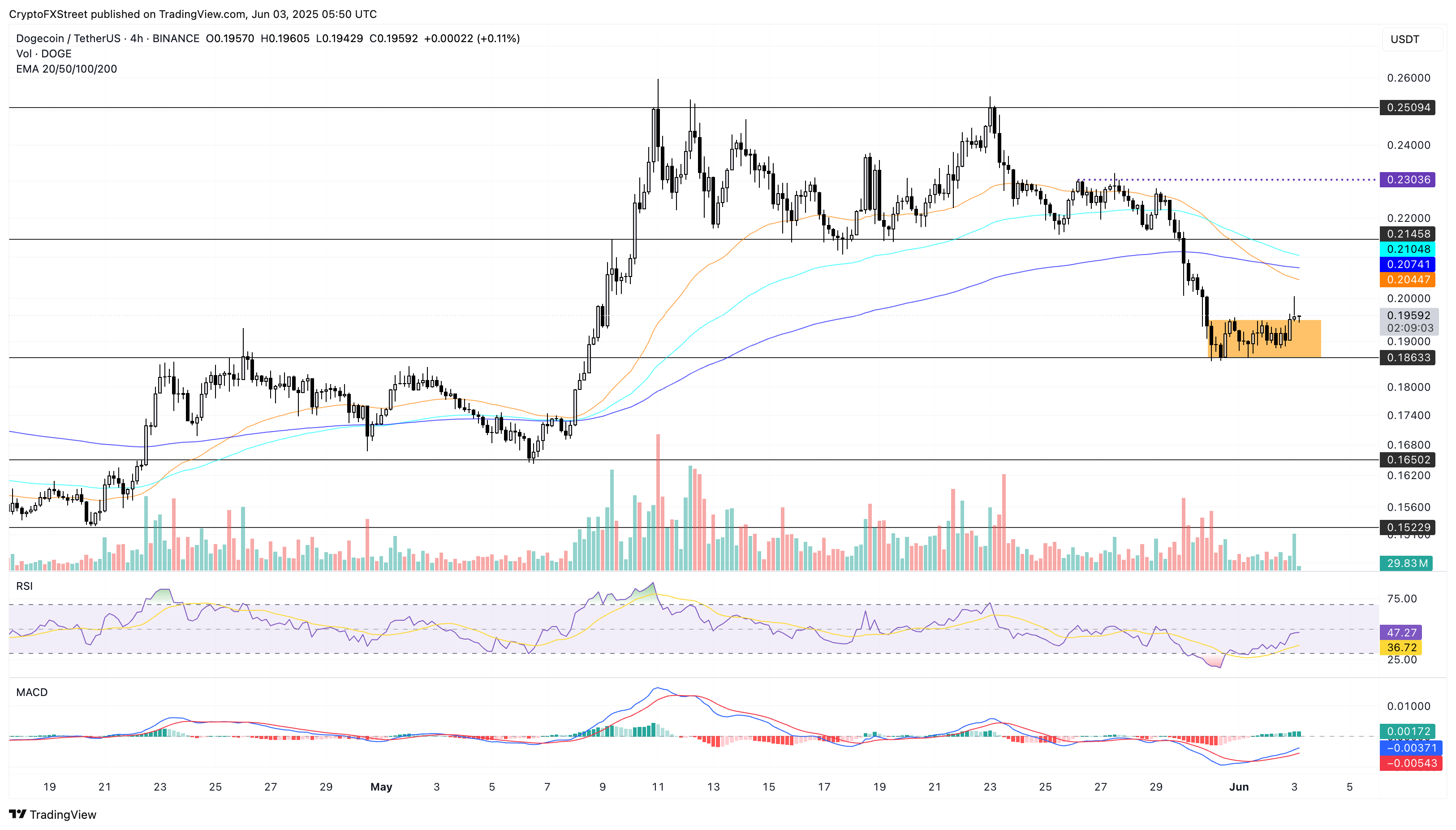 Dogecoin cotiza a 0.1959$ en el momento de la publicación el martes, rompiendo por encima de un rango a corto plazo formado entre 0.1863$ y 0.1950$ tras la caída del 14% de la semana pasada. La moneda meme registra ligeras ganancias intradía y una vela cerrando por encima del límite superior del rango.
