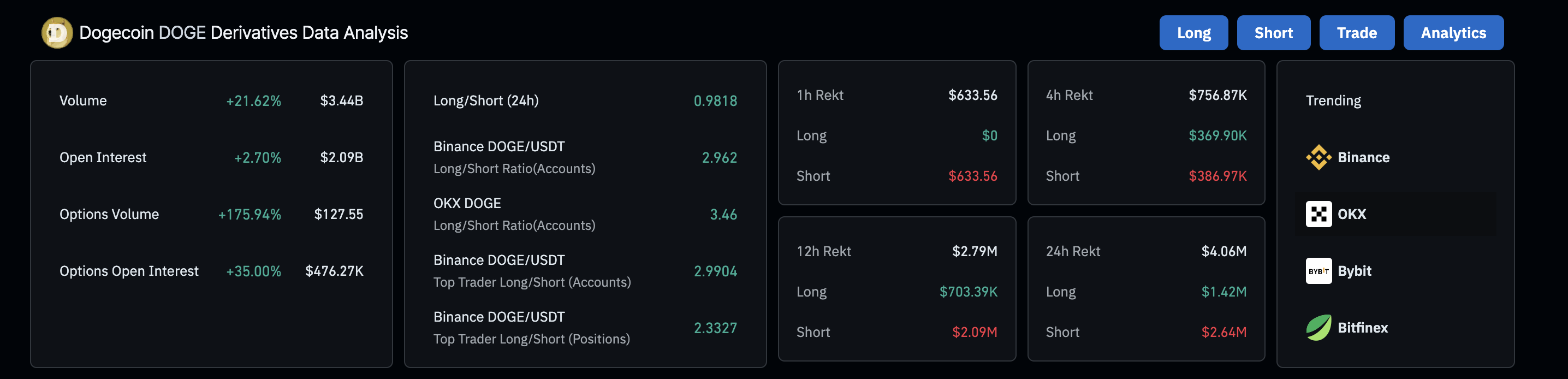 Los datos de CoinGlass muestran que el volumen de Dogecoin en 24 horas ha aumentado un 21% a 3.44 mil millones de dólares, mientras que el Interés Abierto (OI) se dispara un 2.70%, alcanzando 2.09 mil millones de dólares. Un aumento en el OI se relaciona con el creciente flujo de fondos en el mercado de derivados, lo que típicamente conduce a un mayor interés de compra. Notablemente, los datos de liquidación de 24 horas muestran que casi el doble de las posiciones bajistas fueron eliminadas, por un valor de 2.64 millones de dólares, en comparación con las posiciones largas que valen 1.42 millones de dólares.