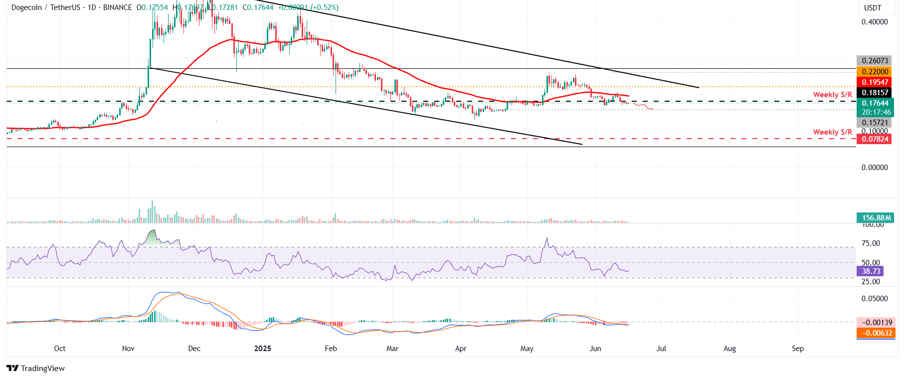 Si DOGE continúa su corrección, podría extender la caída hacia su mínimo del 22 de abril de 0.157$.