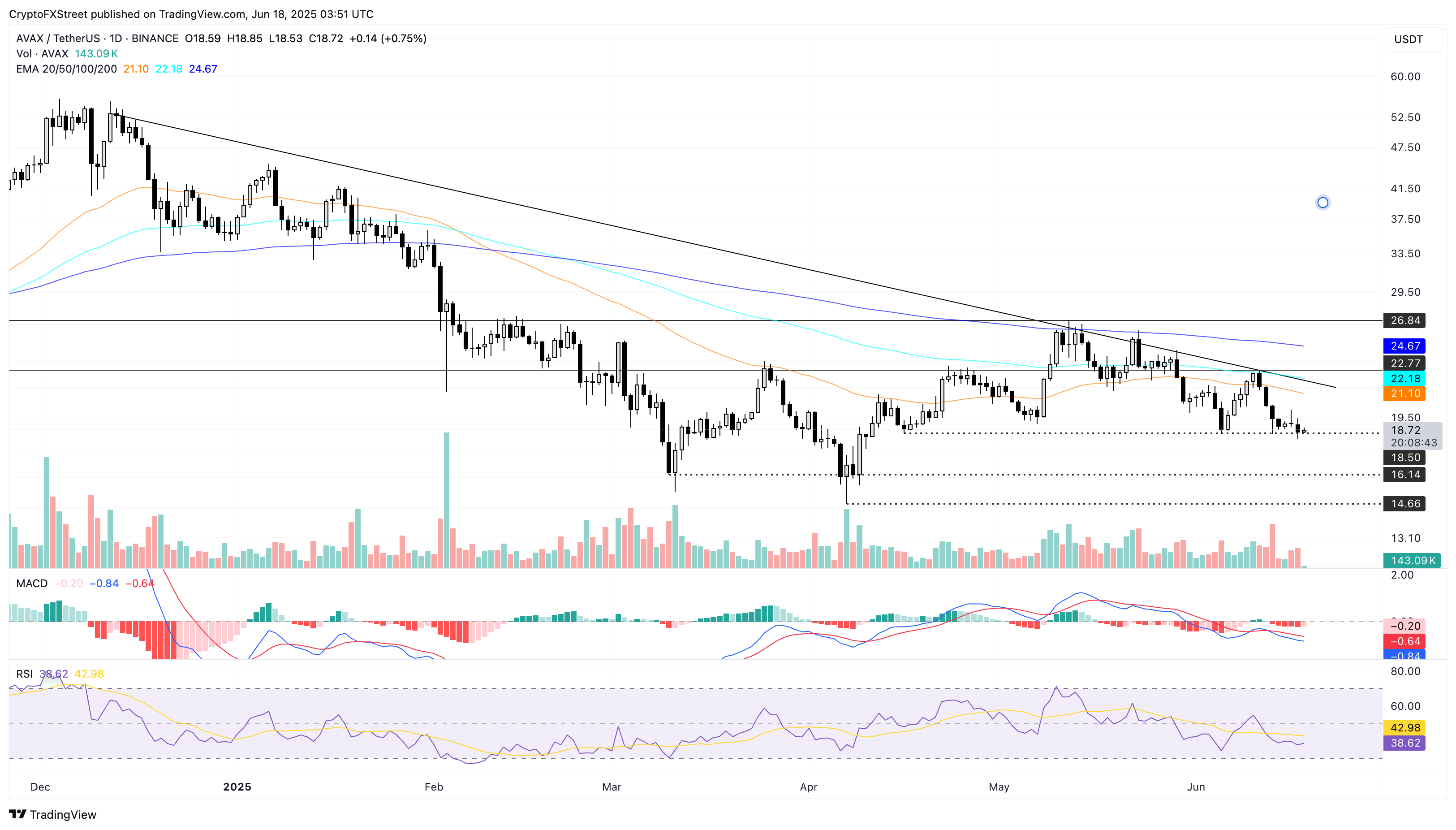 Avalanche podría extender sus pérdidas hacia el soporte de 16.14$ si cierra por debajo del piso de 18.50$, seguido por el mínimo del año hasta la fecha de 14.66$.