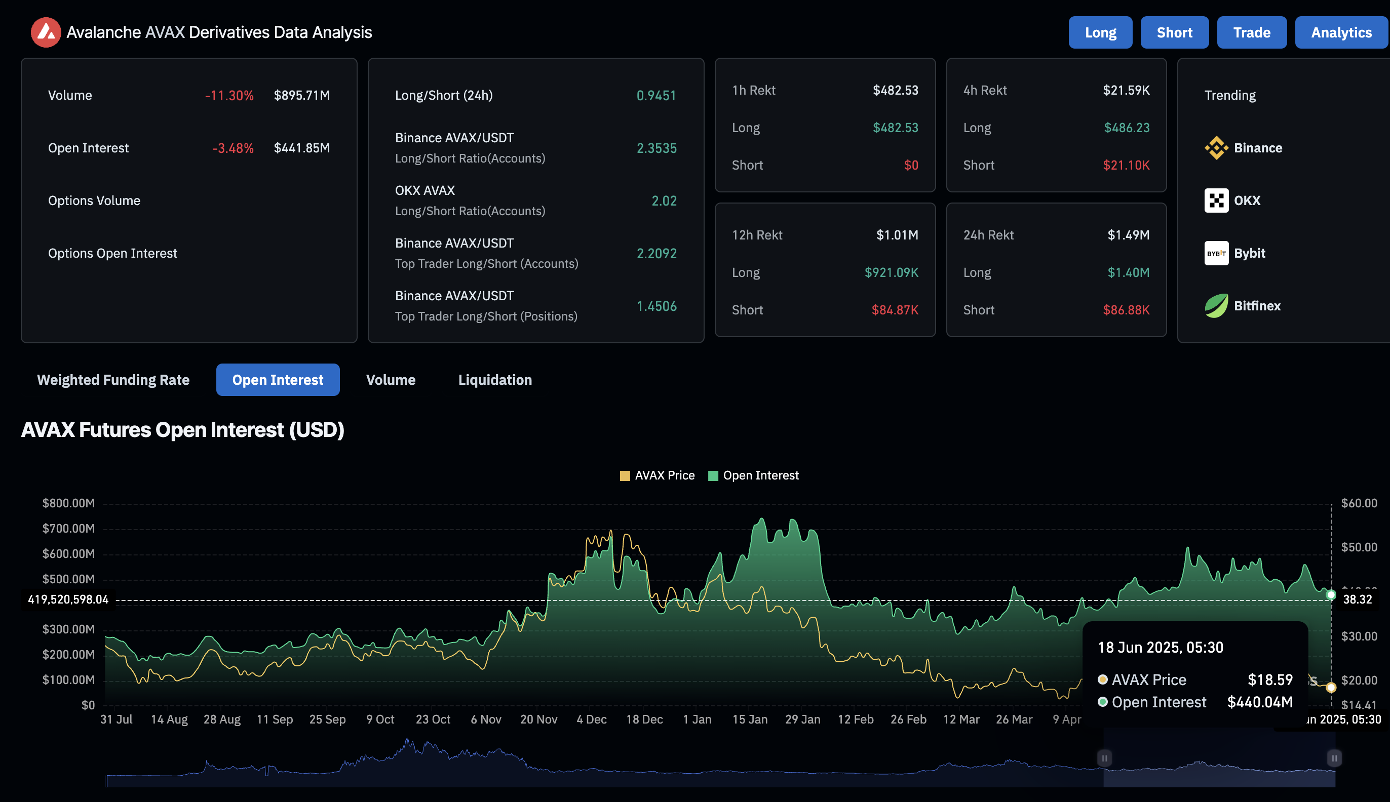 Esto se alinea con el retroceso en AVAX y reduce la relación largo-corto a 0.9451, señalando un mayor número de posiciones bajistas activas.