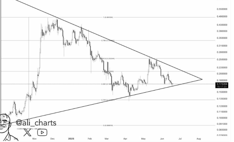 En el gráfico podemos observar a la memecoin comprimiéndose en una cuña de ajuste delimitada por una resistencia descendente y un soporte ascendente, con el precio actualmente rondando el límite inferior de la estructura.