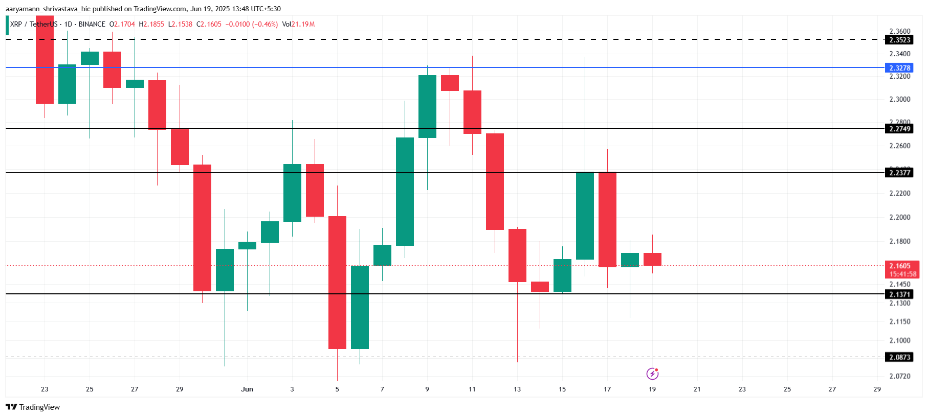 Al momento de escribir, XRP se está negociando a 2.16 dólares, manteniéndose por encima del nivel de soporte de 2.13 dólares. Este soporte ha ayudado a prevenir más caídas, y el escenario probable para XRP es una consolidación por encima de este nivel.
