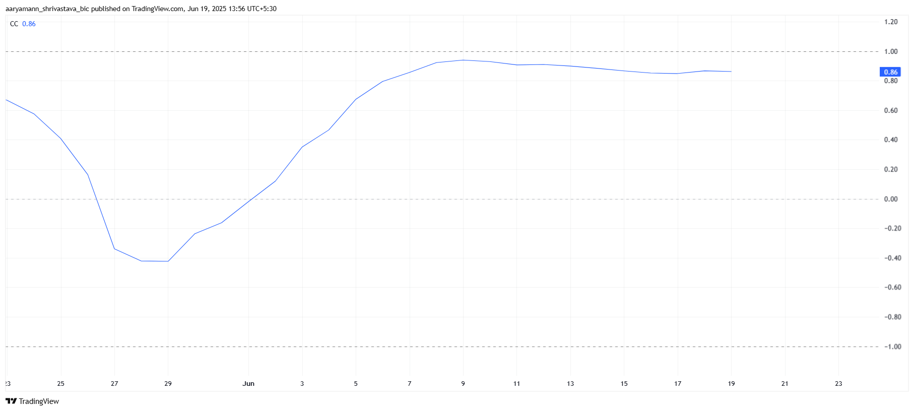 Actualmente, XRP comparte una fuerte correlación de 0.86 con Bitcoin, lo que podría jugar a favor de la altcoin. Si Bitcoin continúa su movimiento ascendente hacia el punto de precio de 110,000 dólares, XRP podría beneficiarse del impulso positivo.