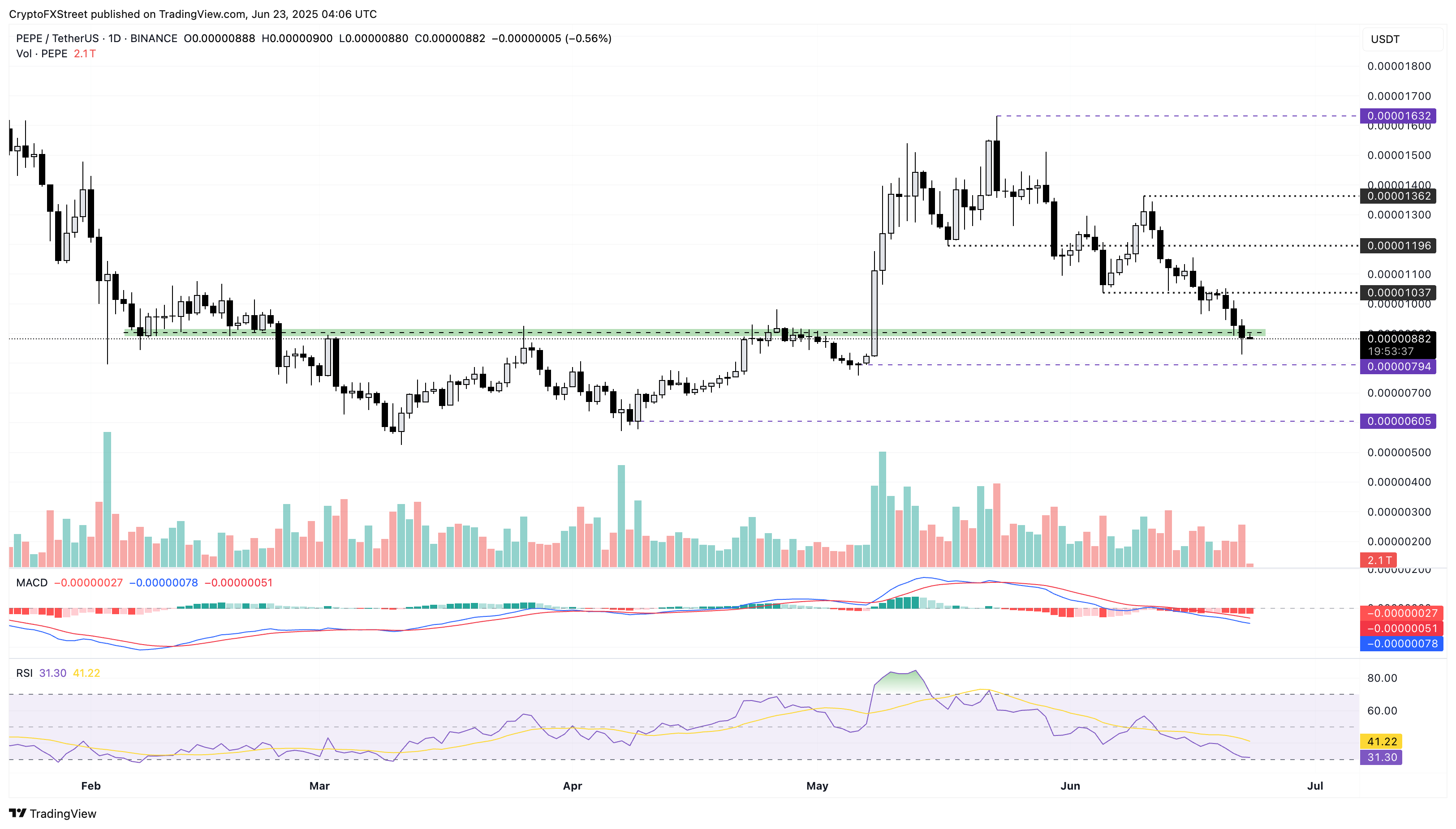 Con el mínimo de la semana pasada de 0.00000830$, PEPE registró el precio más bajo del mes, alimentando el riesgo de una nueva prueba del nivel de 0.00000794$ marcado por el cierre diario más bajo en mayo.
