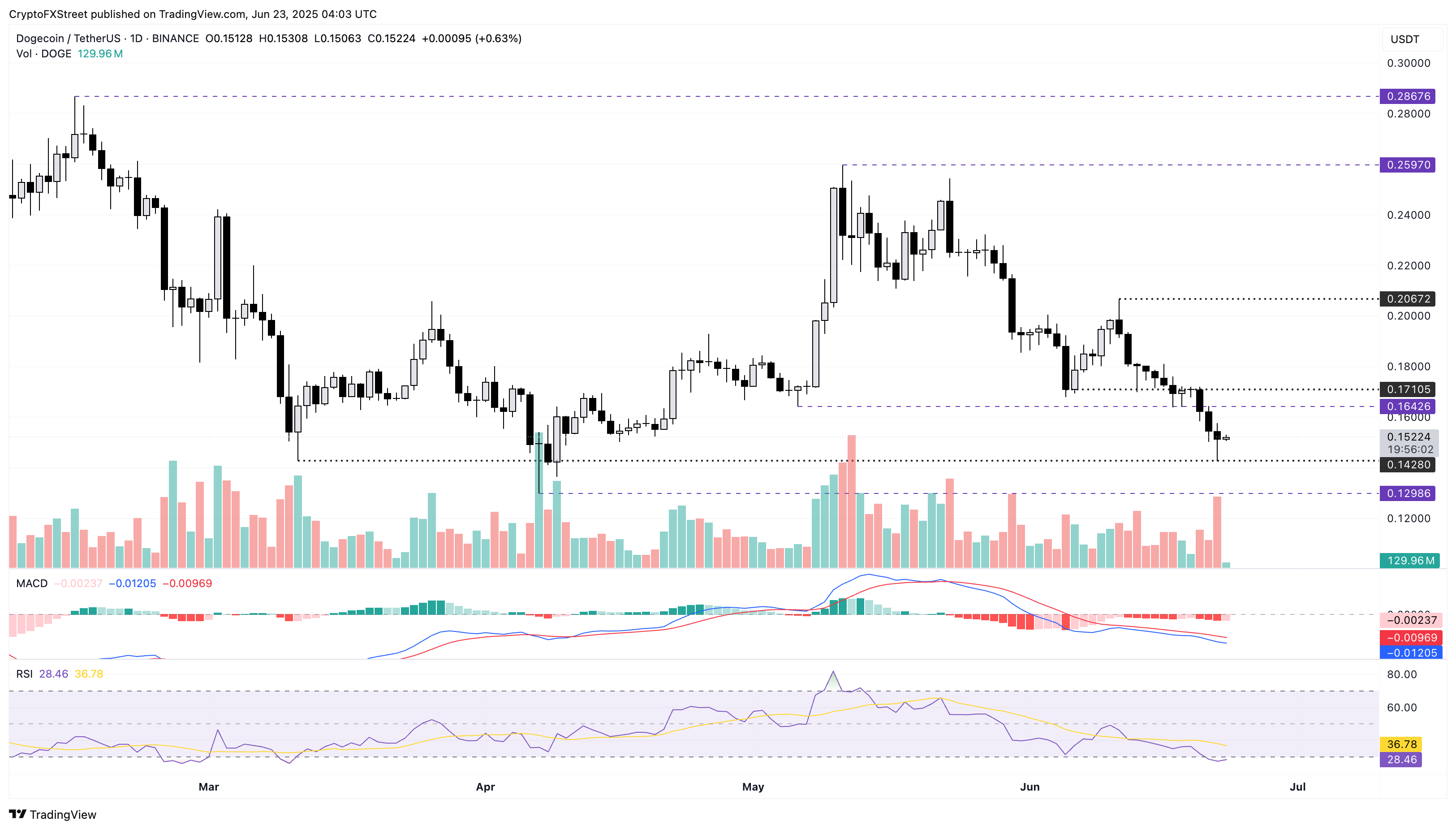 Un cierre por debajo de 0.1428$ podría extender la caída de Dogecoin hacia el mínimo del año de 0.1298$.
