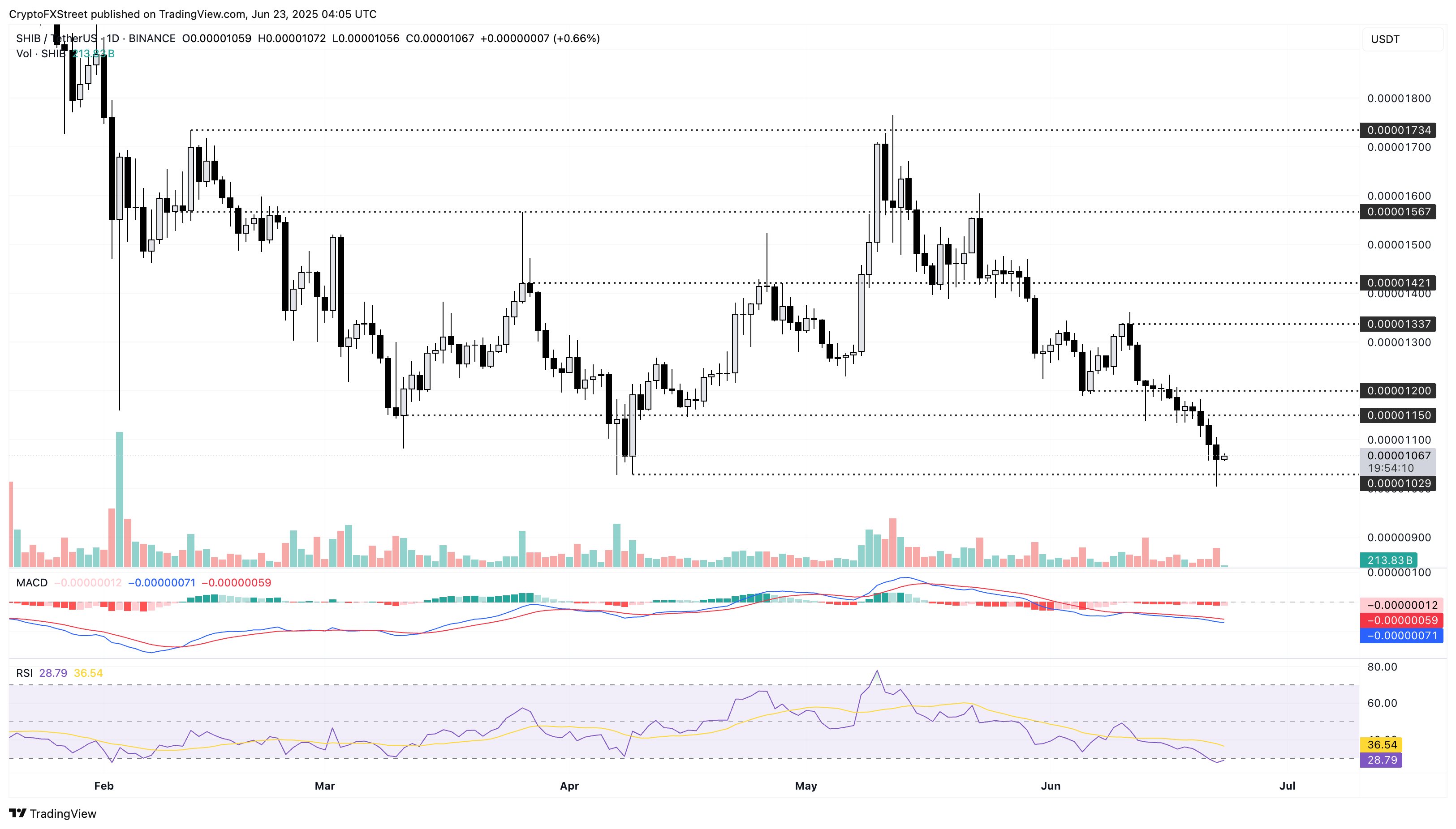 Shiba Inu avanza menos del 1%, manteniéndose en el soporte psicológico de 0.000010$ tras imprimir cuatro velas bajistas consecutivas la semana pasada. Sin embargo, con el mínimo de 24 horas de 0.00001004$ el domingo, SHIB marca el precio más bajo en lo que va del año.