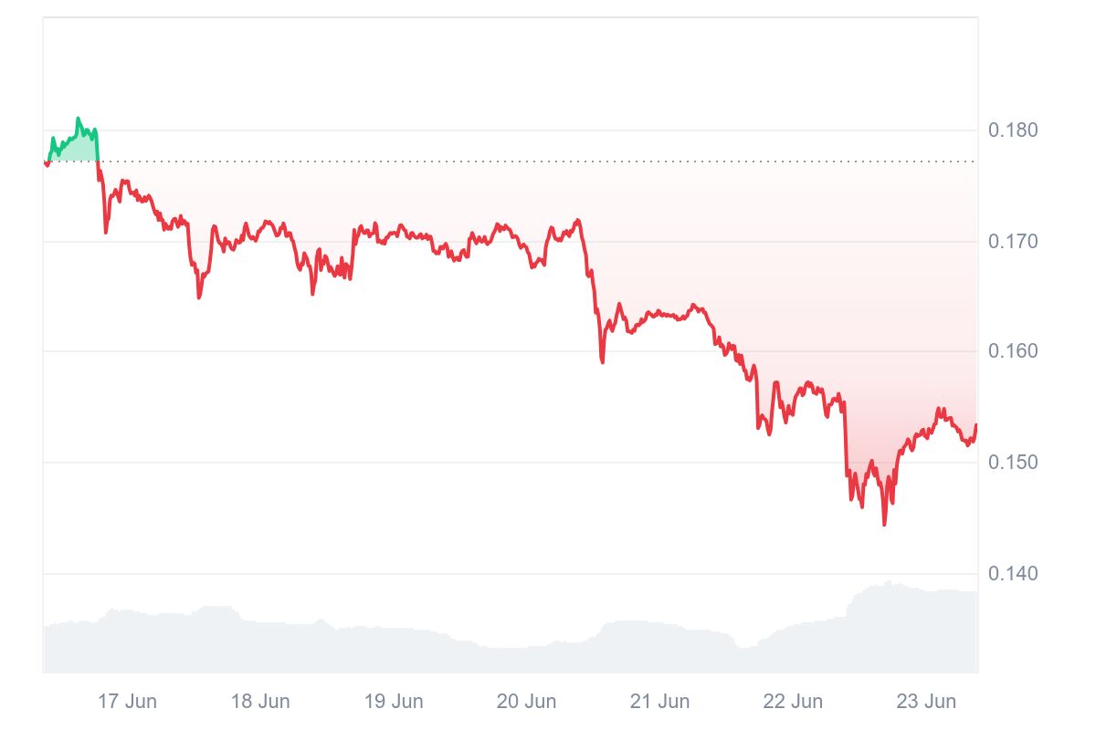 Según los datos de CoinMarketCap, la moneda acumula una caída del 13,45 % en los últimos siete días. Este retroceso llevó el precio del token hasta los 0,1533 dólares por unidad, generando preocupación entre los inversores, quienes temen que la criptomoneda no tenga la fuerza suficiente para sostener ese nivel de soporte en las próximas horas.