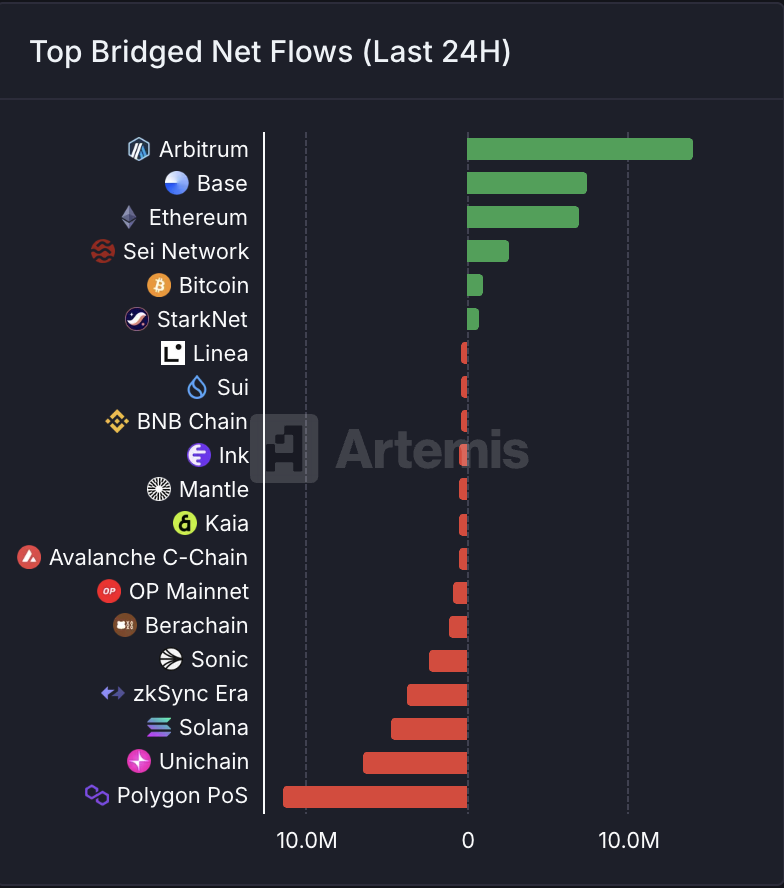 Según Artemis, Sei Network ha visto 3 millones de dólares en flujos netos puenteados en las últimas 24 horas. En comparación, Solana ha visto salidas netas que ascienden a 5 millones de dólares durante el mismo período.