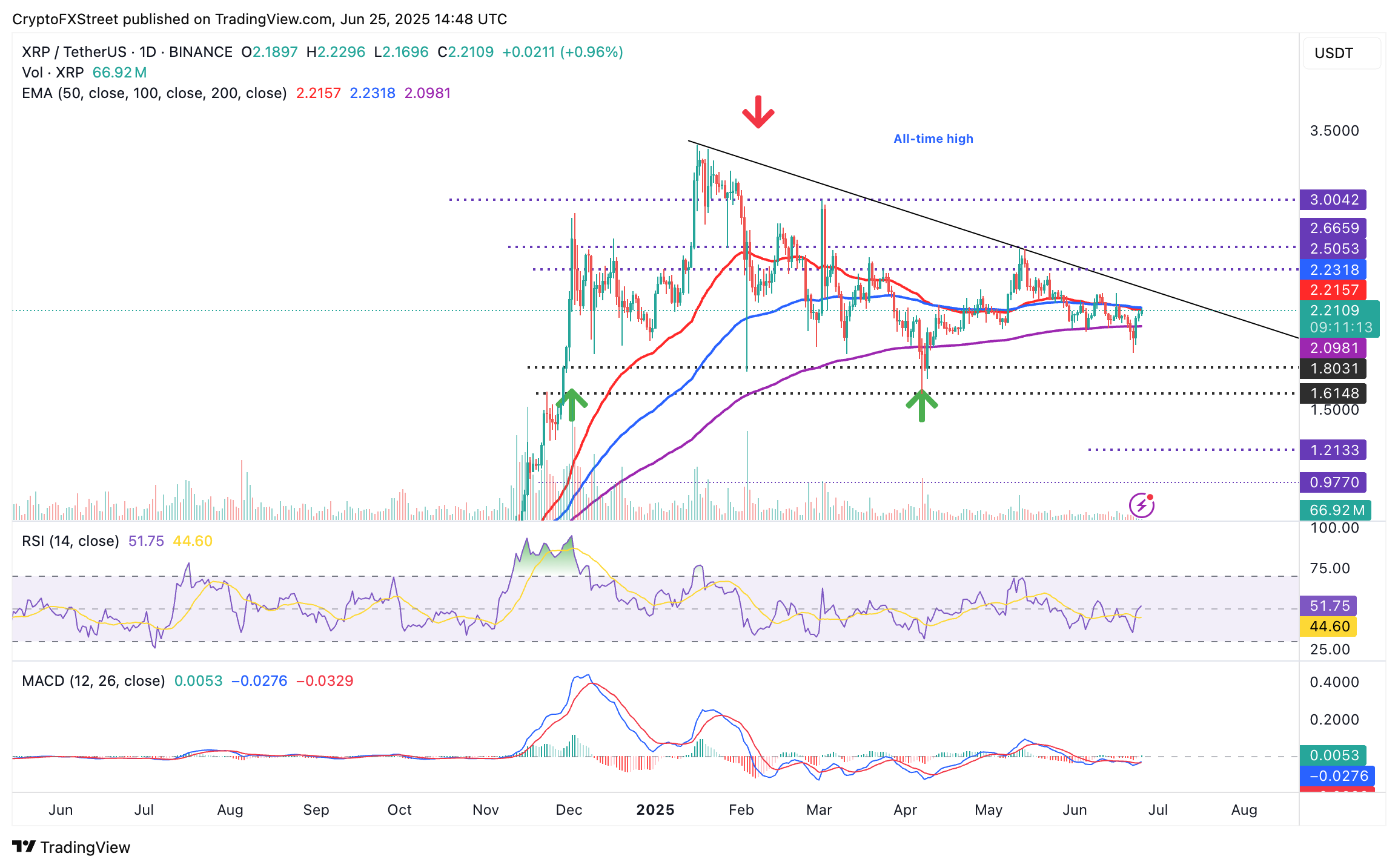El precio de XRP está golpeando una resistencia de confluencia crítica en 2.23$, donde la media móvil exponencial (EMA) de 50 días y la EMA de 100 días convergen. Esto siguió a la extensión de la recuperación desde el mínimo del fin de semana de 1.90$.
