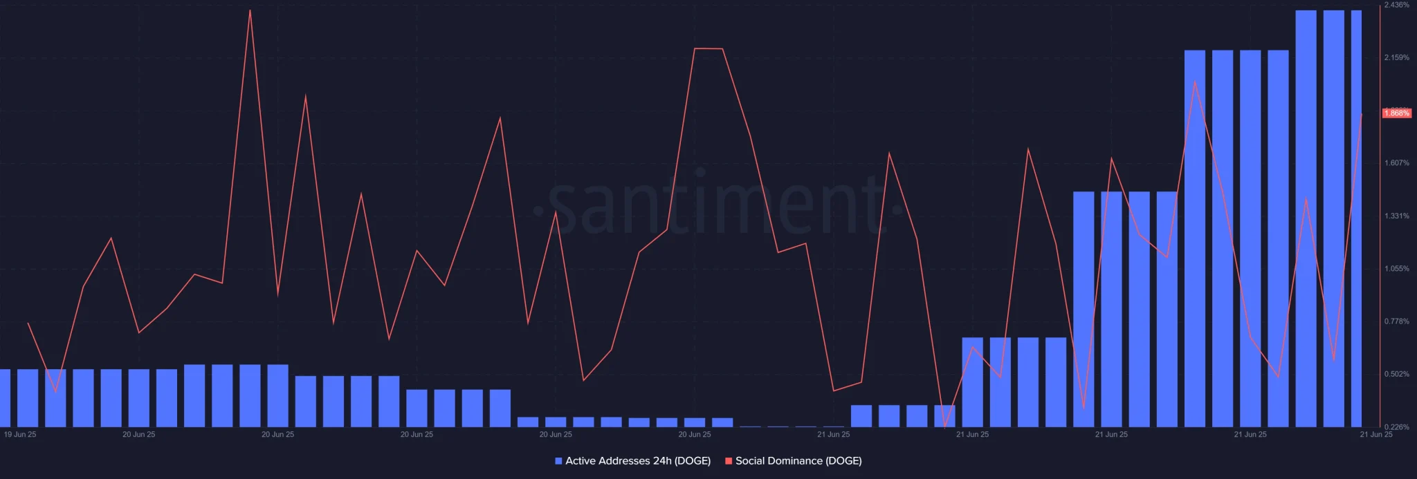 Los datos de blockchain compilados por Santiment revelan un aumento notable en las direcciones activas de Dogecoin desde el 21 de junio. Este auge en la actividad de billeteras indica un aumento en la utilización de la red y la participación de nuevos participantes. Tales métricas a menudo sirven como un indicador adelantado durante períodos de consolidación de precios, reflejando cambios en el sentimiento de los inversores.