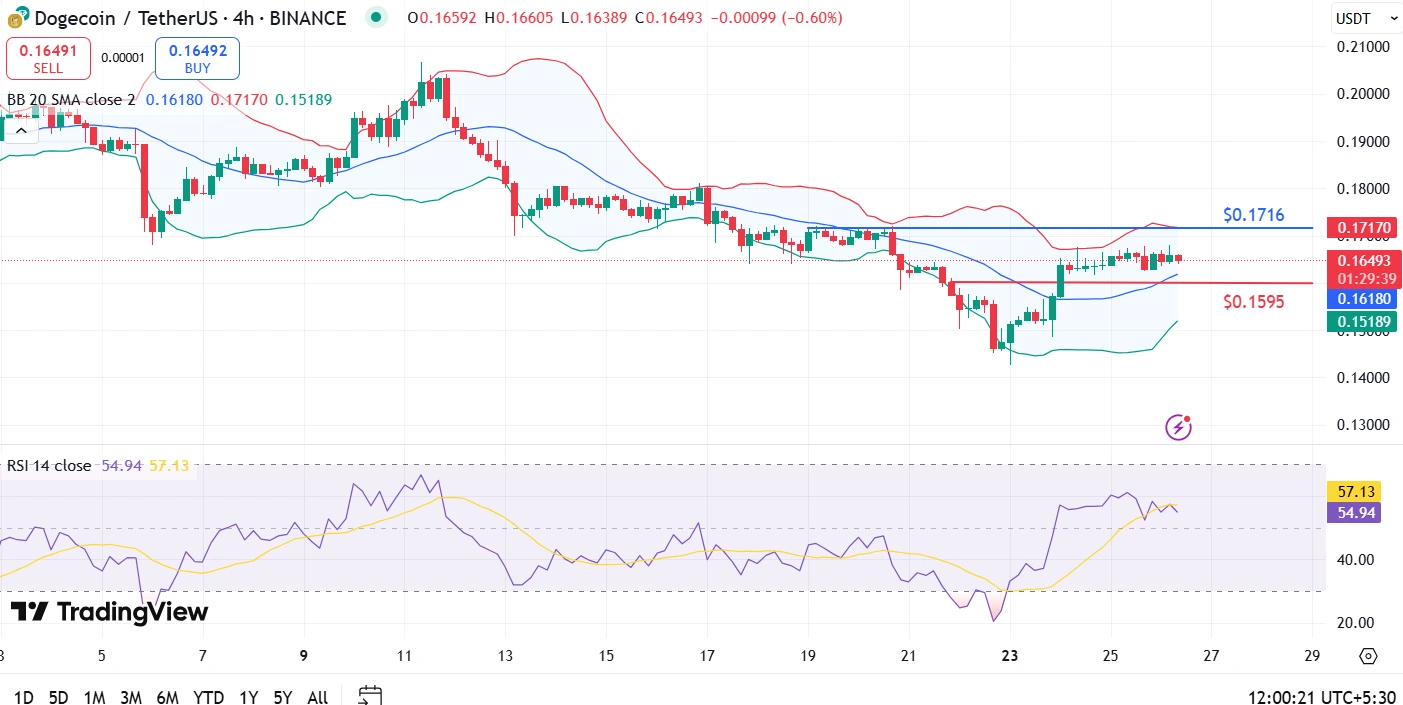 En el gráfico de 4 horas de Dogecoin, las Bandas de Bollinger se están estrechando, lo que indica una reducción de la volatilidad y sugiere un movimiento potencialmente significativo. El precio se encuentra cerca de la banda media, con niveles de soporte y resistencia principales en $0.1617 y $0.1716, respectivamente. El Índice de Fuerza Relativa (RSI) se sitúa en 57.07, lo que sugiere que los compradores continúan ganando terreno sin sobreextenderse. En caso de una corrección más profunda, el nivel de $0.1595 sirve como soporte crítico.