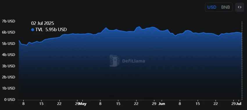 Otro factor crucial que impulsa la estabilidad del precio de BNB es su papel dentro del mercado de criptomonedas en general. BNB Smart Chain (BSC) tiene un valor total bloqueado (TVL) de 5,95 mil millones de dólares, lo que contribuye significativamente al crecimiento y estabilidad continuos de BNB.