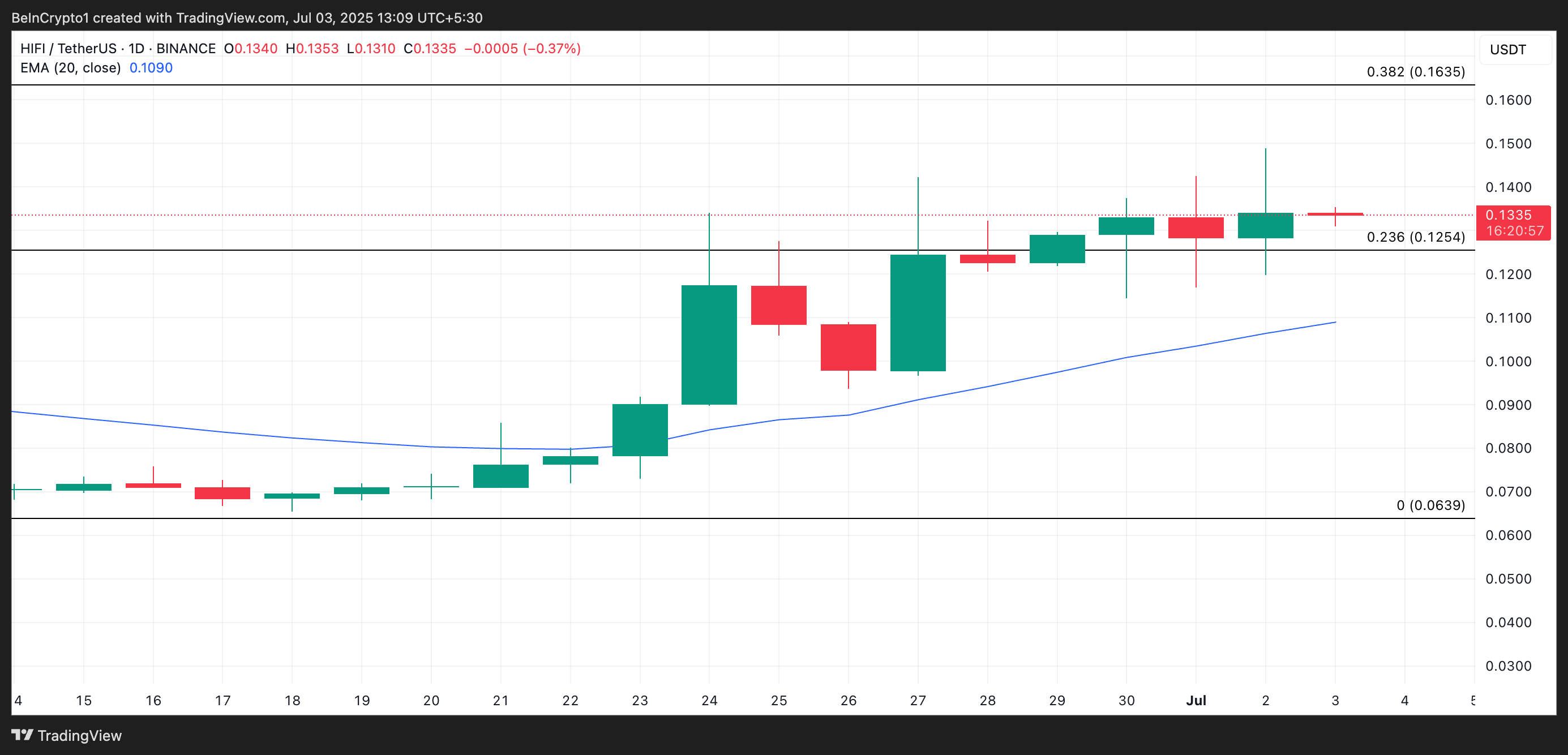 HIFI se negocia a 0.133 dólares, un aumento del 31% en los últimos siete días. La altcoin RWA actualmente se negocia por encima de su media móvil exponencial de 20 días en el gráfico diario, confirmando la presión del lado de compra.
