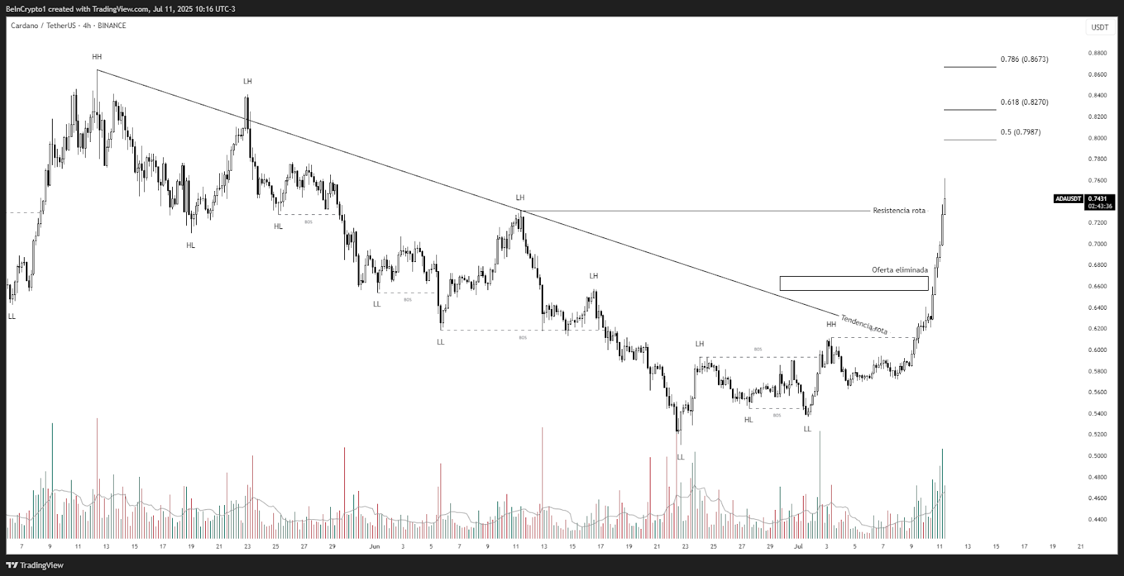 Cardano (ADA) también ha roto su estructura bajista con combicción. En el gráfico de 4 horas, el precio ha invalidado zonas de oferta y superado resistencias descendentes, con un rally explosivo que llevó el precio a los 0.79 dólares. La eliminación de oferta previa sugiere una fuerte absorción por parte de los compradores.
