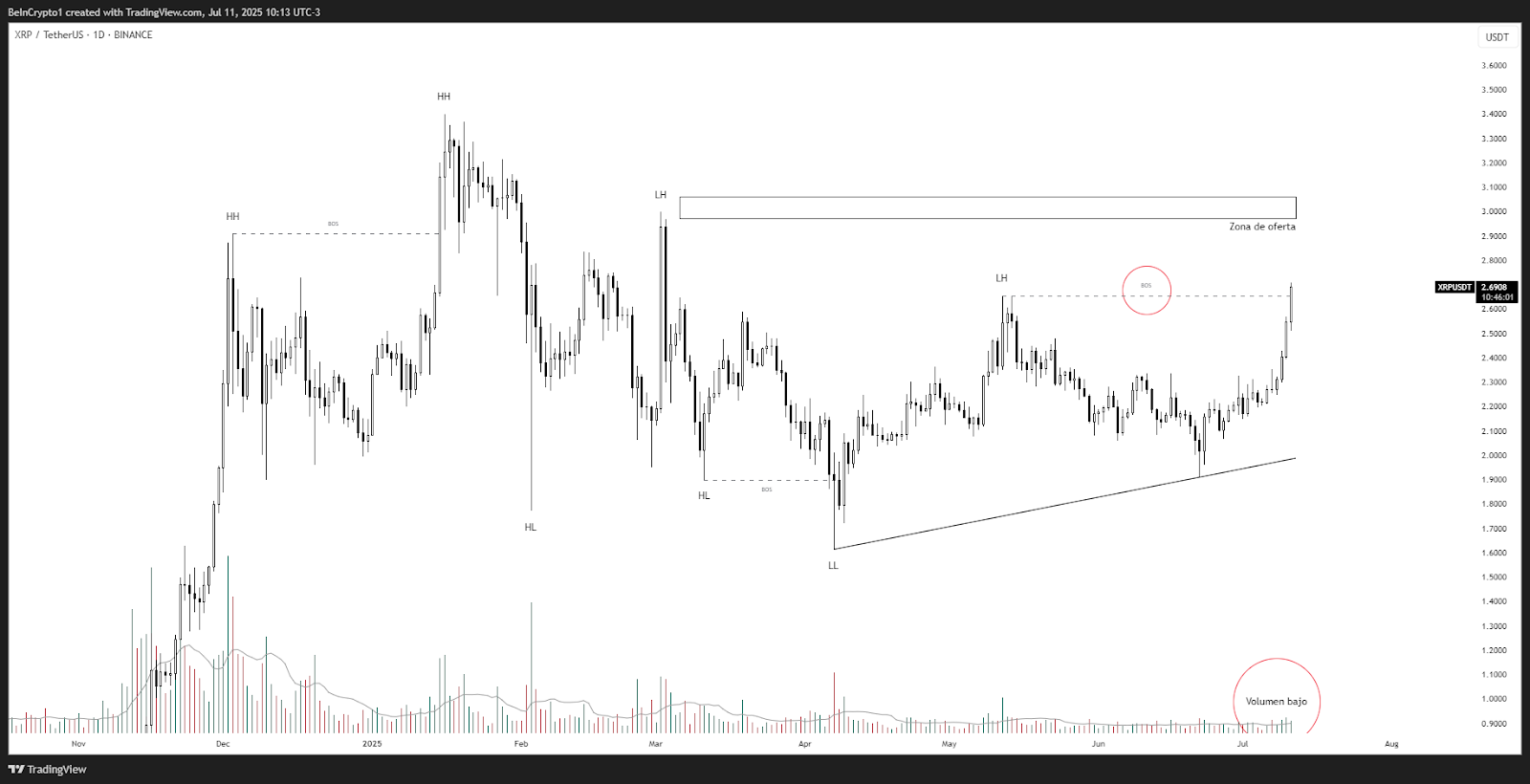 El gráfico diario de XRP muestra una ruptura alcista confirmada (BOS) sobre los 2.60 dólares, acompañada de una formación de mínimos ascendentes. A pesar del volumen relativamente bajo, la ruptura de estructura invita a pensar en un cambio de tendencia en desarrollo.