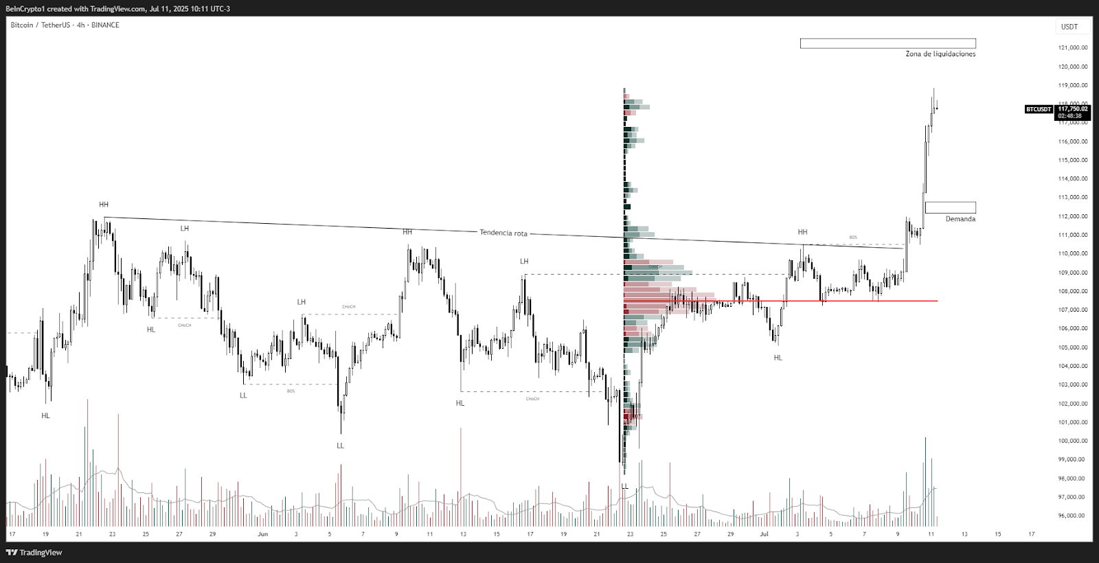 El gráfico de BTCUSDT en temporalidad de 4 horas muestra una clara ruptura de estructura al alza, con una secuencia de mínimos y máximos crecientes.