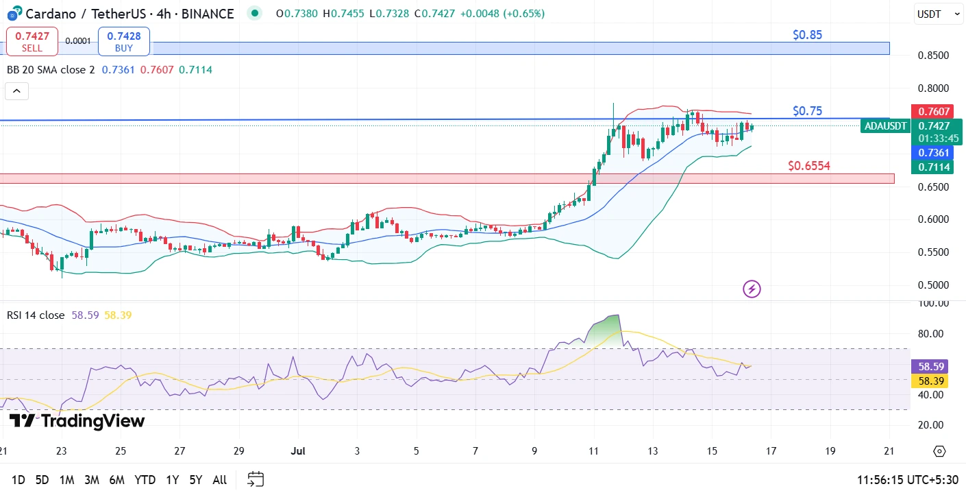 - Cardano superó el nivel de resistencia de $0.74 atrayendo atención significativa.