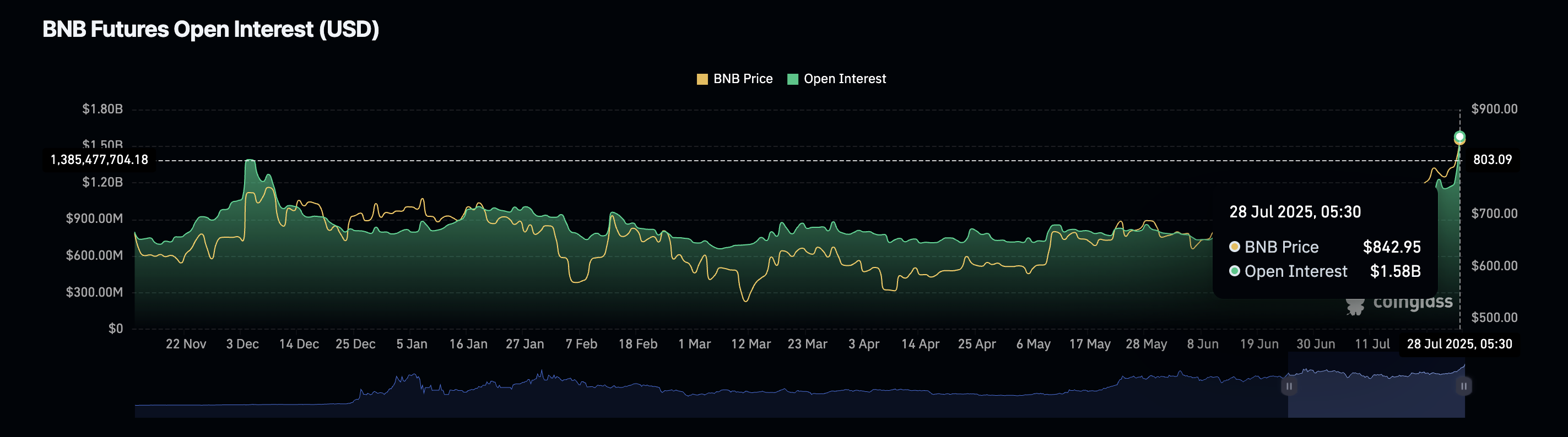 El interés abierto de BNB (OI) alcanza un máximo histórico de 1.580 millones de dólares, subiendo desde 1.200 millones de dólares el domingo. La entrada de capital de 380 millones de dólares en derivados de BNB refleja un aumento del interés por parte de los operadores.