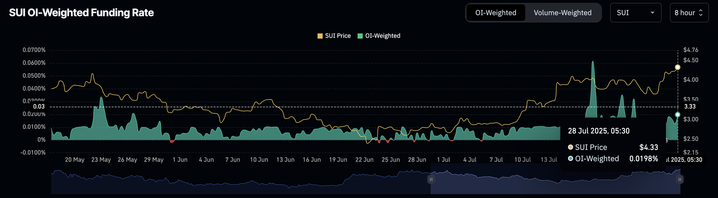 SUI baja casi un 1% hasta ahora el lunes después de alcanzar 4.44$ más temprano en el día, marcando un máximo de seis meses. La reciente tendencia alcista que supera los 4.29$ marca una recuperación completa del hackeo de Cetus en mayo.