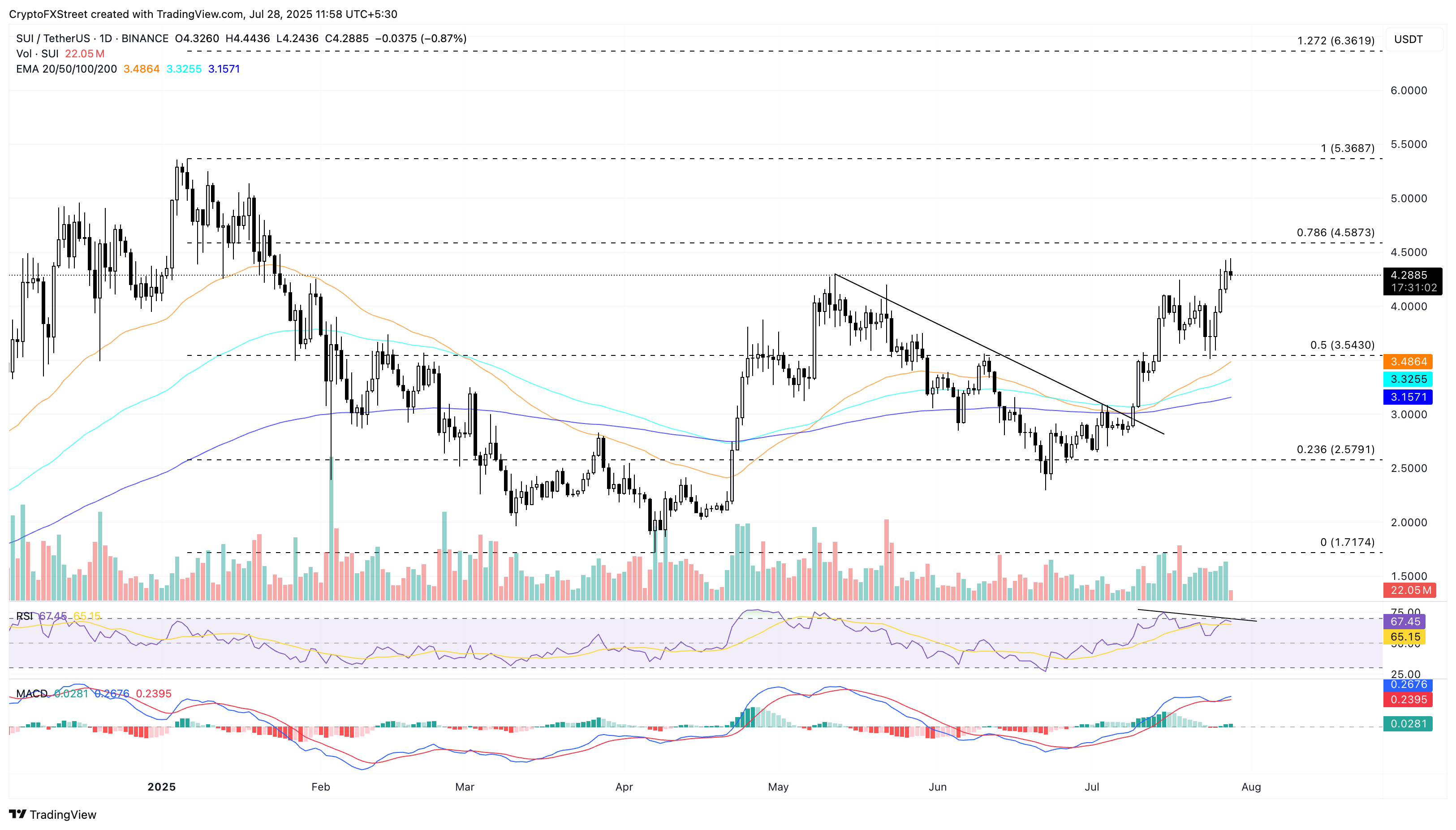 Si SUI mantiene el impulso alcista, podría extender el repunte hasta el nivel de Fibonacci del 78.6% en 4.58$. Un cierre potencial por encima de este nivel aumentaría las posibilidades de que SUI recupere el hito de 5$.