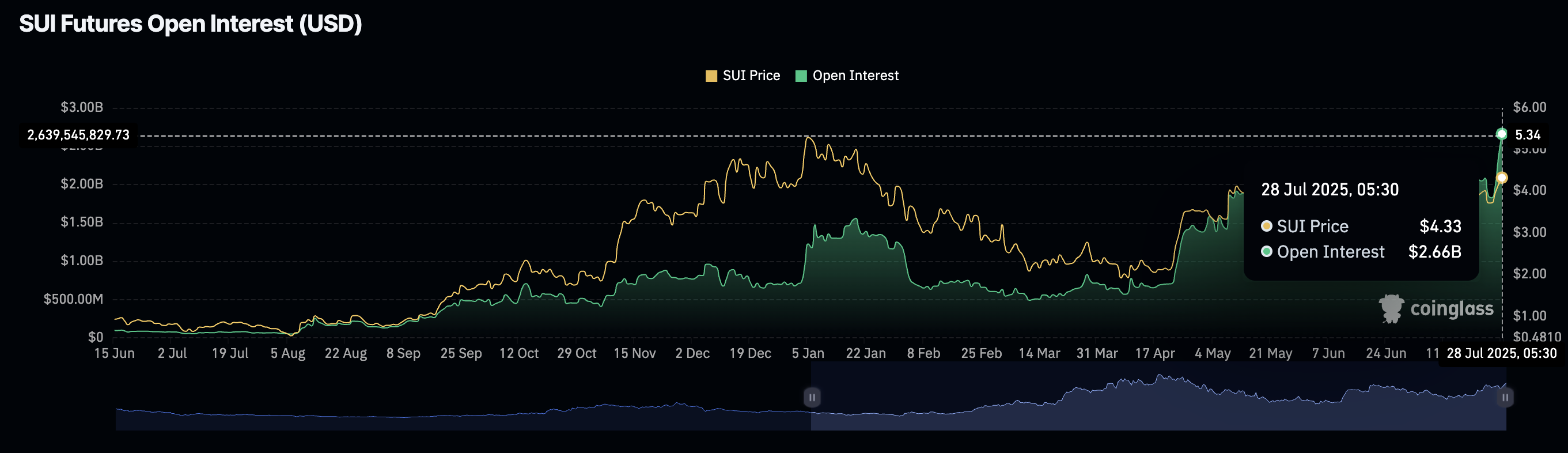 Los datos de Coinglass muestran que el Interés Abierto (OI) de SUI ha aumentado a 2.66 mil millones de dólares, subiendo desde 2.36 mil millones el domingo. El aumento de 30 mil millones de dólares en las últimas 24 horas indica un flujo de capital significativo, probablemente impulsado por el creciente interés entre los operadores.