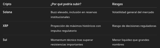 Para ChatGPT, criptomonedas como Solana (SOL), XRP (Ripple) y Sui (SUI) destacan por su configuración técnica y el interés creciente que despiertan en el mercado. Cada una presenta patrones gráficos que, de confirmarse, podrían traducirse en movimientos significativos durante el mes de agosto.