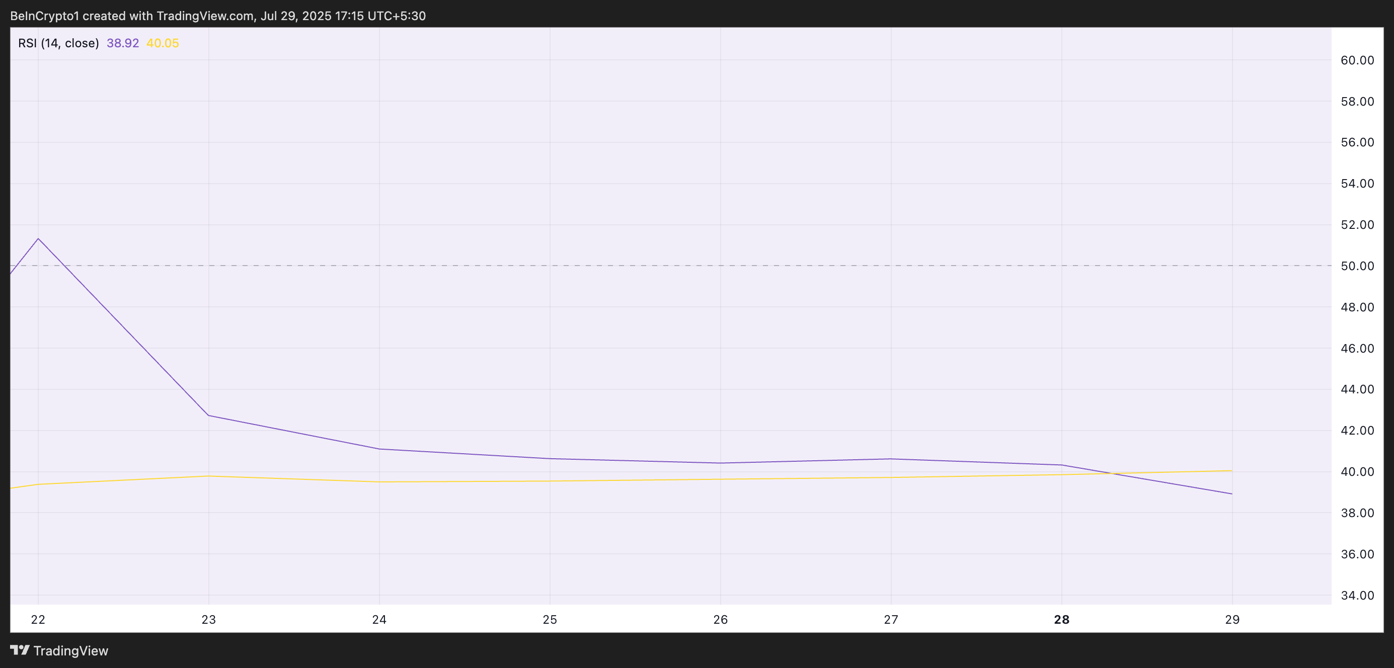 Con un valor de 38.92 y en descenso, el RSI de PI señala un creciente momentum bajista a medida que se acerca agosto. Esto sugiere que el token podría enfrentar más caídas a menos que surja una reversión pronto.