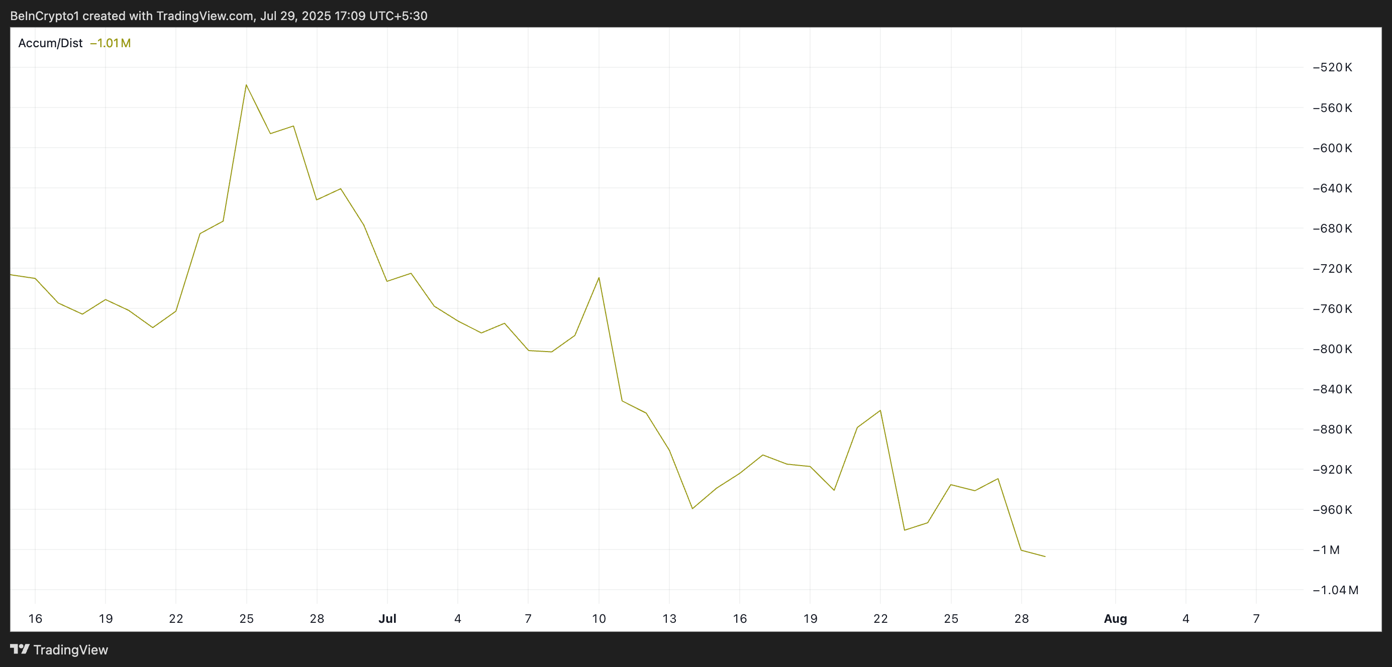Las lecturas del gráfico diario muestran indicadores técnicos que emiten señales bajistas, sin signos claros de reversión. Por ejemplo, la línea de Acumulación/Distribución (A/D) de PI, una medida del volumen de compra frente al de venta, ha disminuido constantemente desde el 26 de junio.