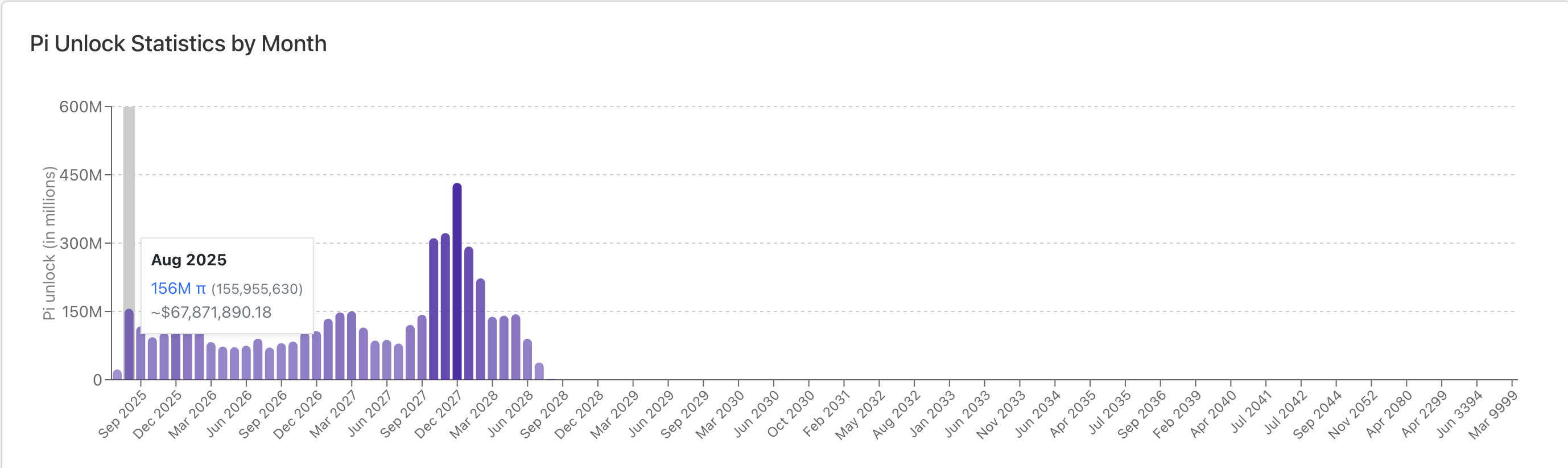 Pi Network enfrenta un evento significativo de desbloqueo de tokens en agosto. Según datos de PiScan, 156 millones de tokens, con un valor aproximado de 68 millones de dólares a los precios actuales, están programados para ser desbloqueados durante el período de 31 días.