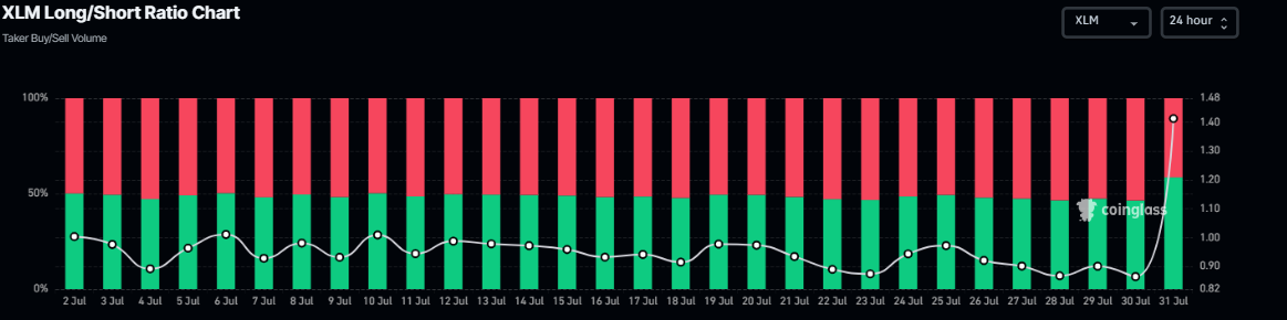 Los datos de derivados de Stellar indican una posible reversión. Según Coinglass, la relación larga-corta para XLM ha alcanzado 1.14 el jueves, el nivel más alto en más de un mes. La relación por encima de uno sugiere que más operadores están apostando a que el precio de XLM suba.
