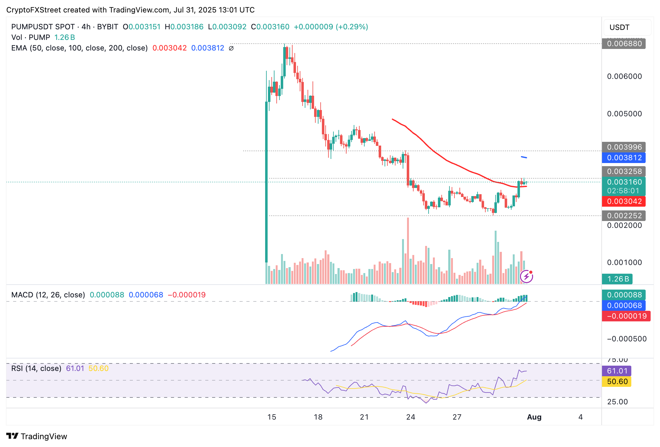 El token nativo de la plataforma de lanzamiento de monedas meme Pump.fun actualmente se mantiene por encima de un soporte a corto plazo proporcionado por la Media Móvil Exponencial (EMA) de 50 períodos en 0.0030$ en el gráfico de 4 horas.