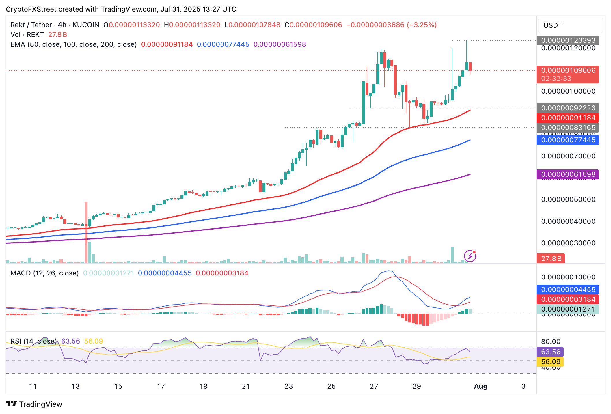 En cuanto a REKT, la tendencia alcista muestra signos de debilidad tras alcanzar un nuevo máximo histórico de 0.000001233. La moneda meme se sitúa en 0.000001096, respaldada por el Índice de Fuerza Relativa (RSI) que muestra debilidad tras tocar territorio de sobrecompra y declinar poco después.