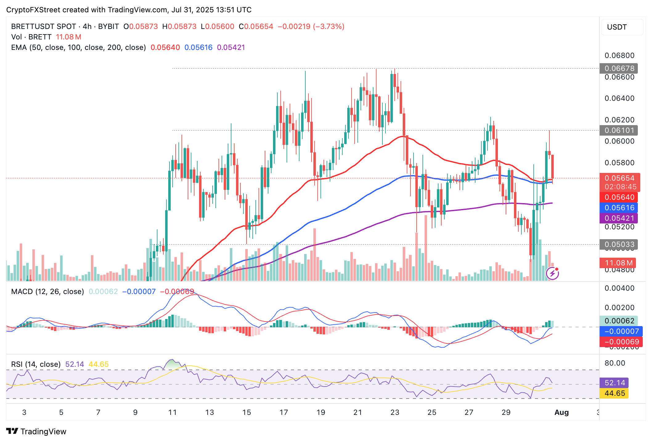 Brett, por otro lado, está recortando rápidamente sus ganancias intradía, indicando un aumento de la volatilidad en el sector de monedas meme en el momento de escribir. El token se cotiza actualmente a 0.0565$ y se mantiene por encima de un soporte inicial proporcionado por la EMA de 100 períodos en 0.0561$.