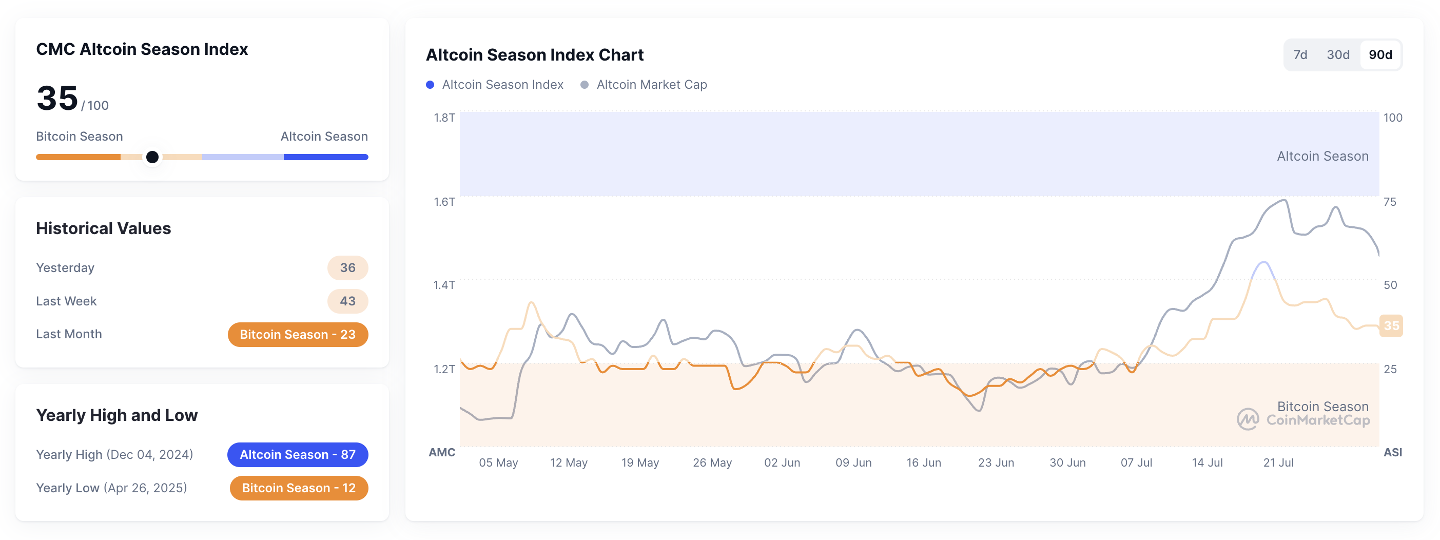 El descenso del Índice de Temporada de Altcoins de CoinMarketCap a 35 es una clara indicación de que el capital se está consolidando en Bitcoin, percibido como un refugio seguro. El movimiento del índice desde 43 la semana pasada subraya las fuertes presiones de venta enfrentadas por los altcoins en el último día.
