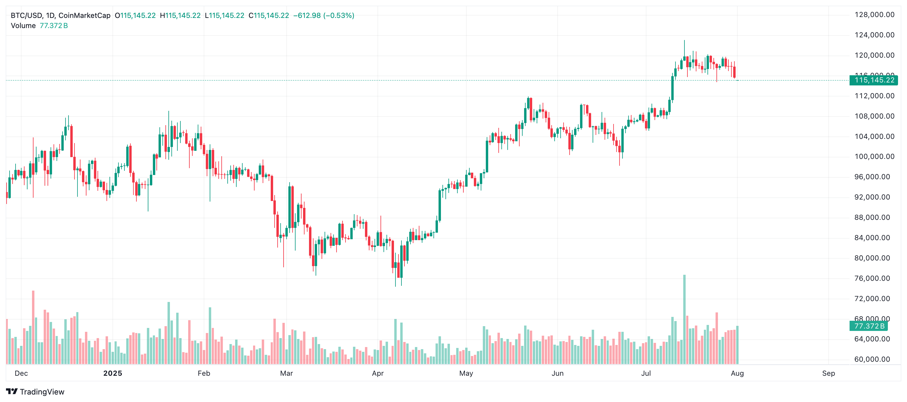 El mercado de criptomonedas experimentó una caída significativa el 1 de agosto, marcada por una venta masiva que provocó una disminución del 2.4% en el valor total del mercado, alcanzando los $3.78 billones en 24 horas. Según CoinMarketCap, Bitcoin (BTC) cayó más del 2% a $115,957, mientras que Ethereum (ETH) experimentó una caída del 3.6%, situándose en $3,717. Simultáneamente, Solana (SOL) cayó un 4.8%, Cardano (ADA) un 4.89%, Dogecoin (DOGE) un 5.87%, y XRP perdió aproximadamente un 3.7% de su valor. El Índice de Temporada de Altcoins se desplomó a 35, redistribuyendo el dominio del mercado de nuevo a Bitcoin.